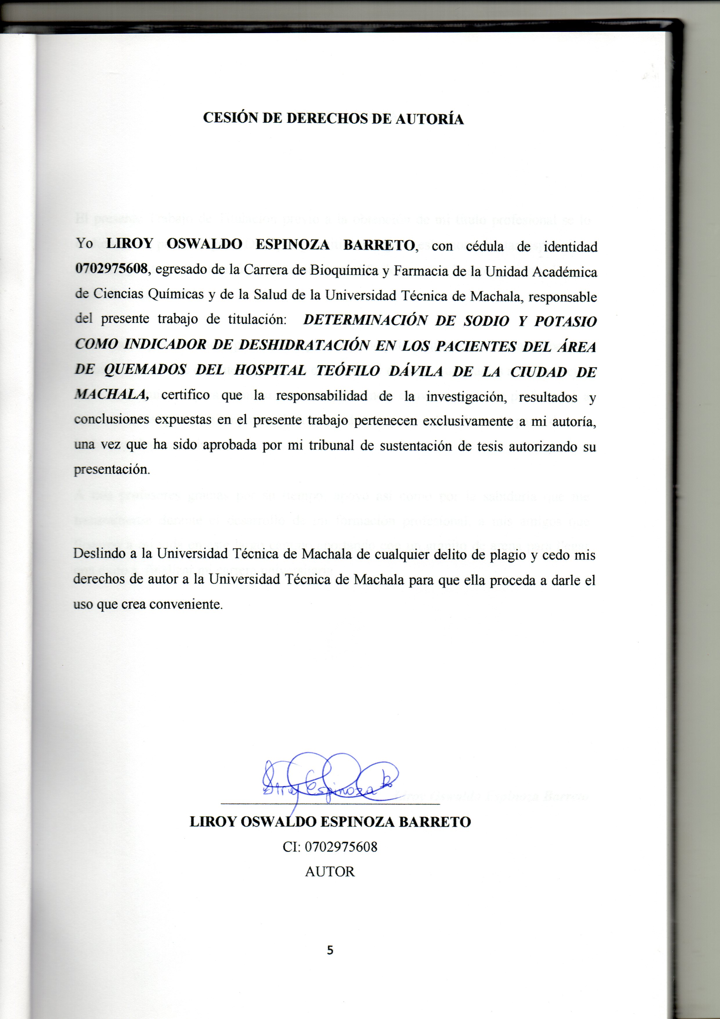 Espinoza Barreto,L. O.(2015).Determinación de sodio y potasio como indicador de deshidratación en los pacientes del área de quemados del hospital Teófilo Dávila de la ciudad de Machala.(trabajo de titulación). UTMACH, Unidad Académica de Ciencias Química y de la Salud, Machala, Ecuador.