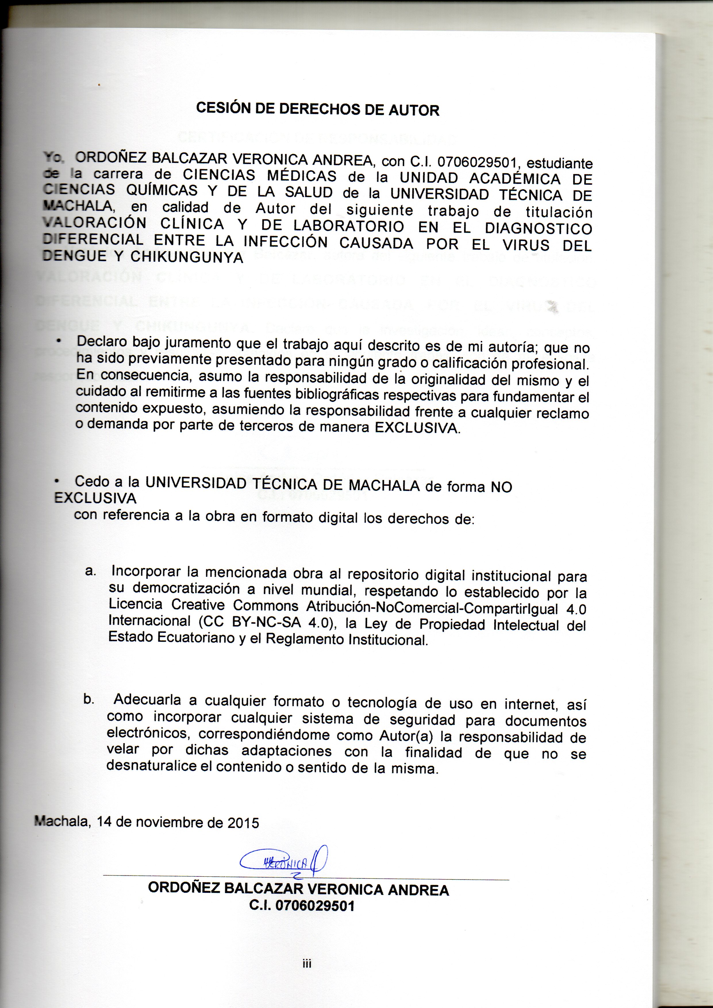 Ordoñez Balcázar, V. A. (2015) Valoración clínica y de laboratorio en el diagnóstico diferencial entre la infección causada por el virus del Dengue y Chikungunya. (Examen complexivo). UTMACH, Unidad Académica de Ciencias Química y de la Salud, Machala, Ecuador.