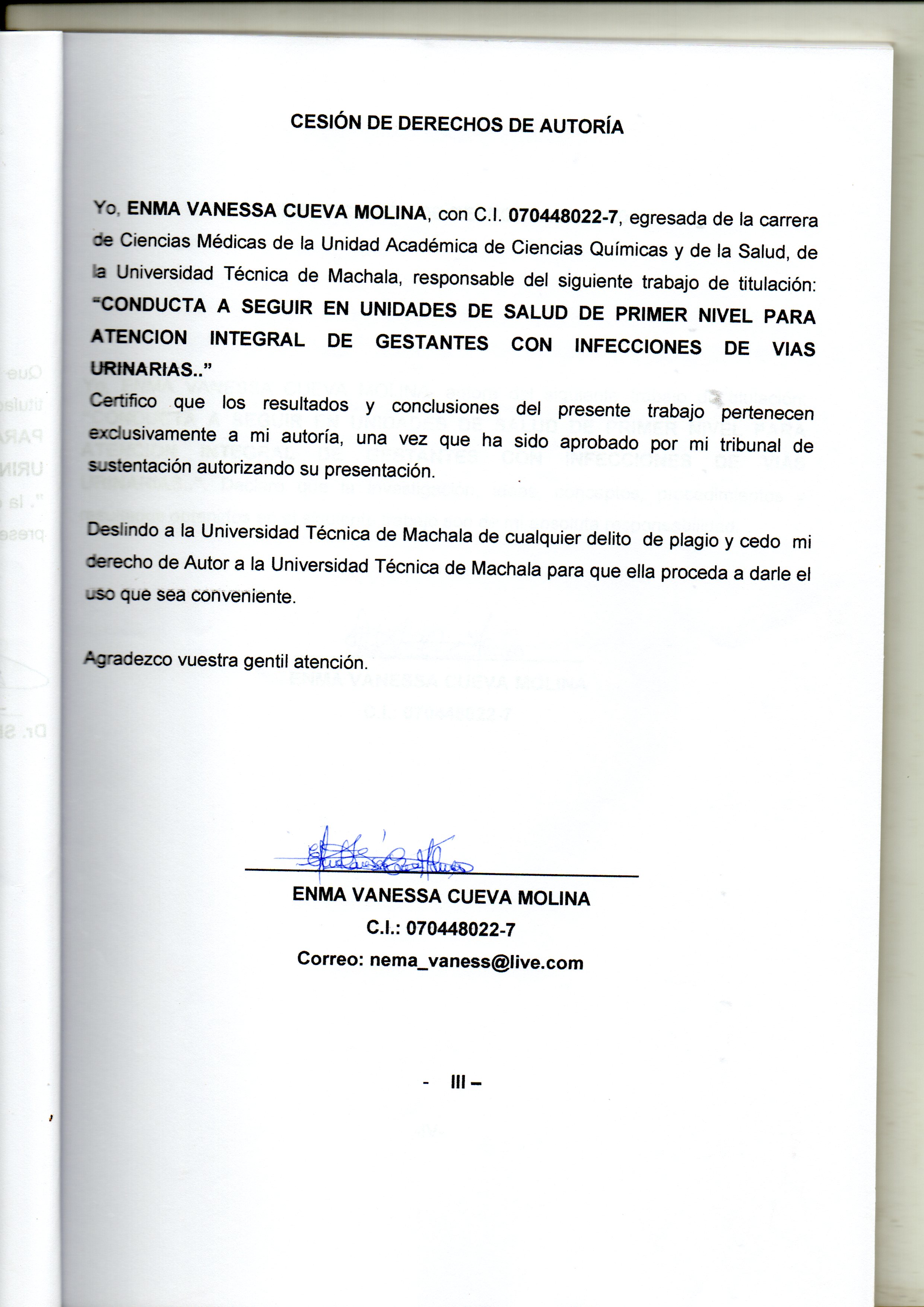 Cueva Molina, E.V. (2015).Conducta a seguir en unidades de salud de primer nivel para atención integral de gestantes con infección de vías urinarias. (Examen complexivo). UTMACH, Unidad Académica de Ciencias Química y de la Salud, Machala, Ecuador.