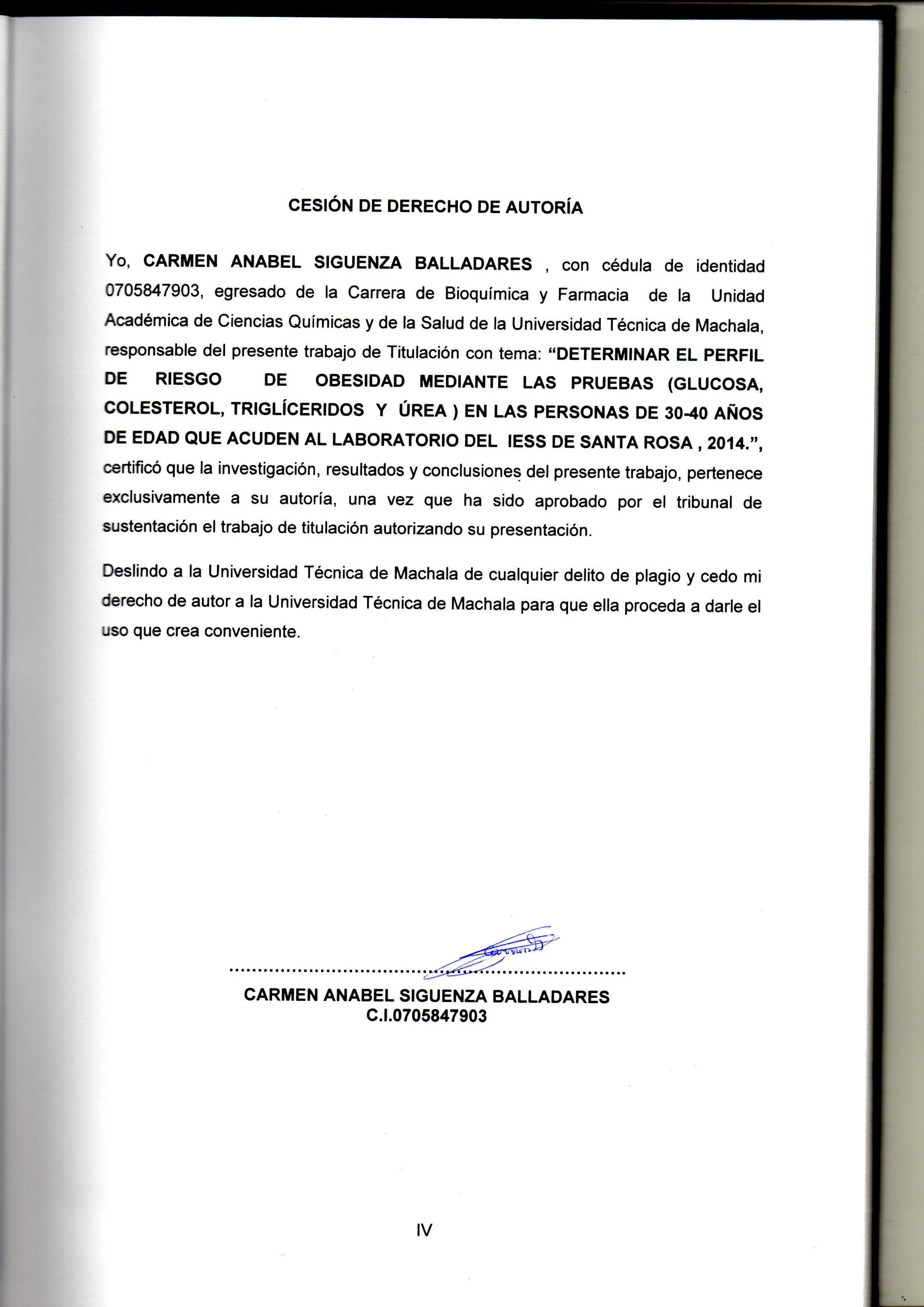 Siguenza Balladares,C,A. (2015).Determinar el perfil de riesgo de obesidad mediante las pruebas (glucosa , colesterol , triglicerios y uera) en la personas de 30-40 años de edad que acuden al laboratorio del IESS se Santa Rosa , 2014. (trabajo de titulación). UTMACH, Unidad Académica de Ciencias Química y de la Salud, Machala,Ecuador.