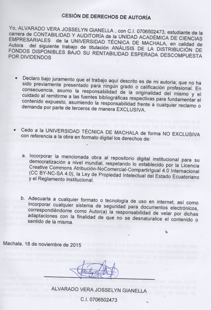 Alvarado Vera, J. G. (2015). Análisis de la distribución de fondos disponibles bajo su rentabilidad esperada descompuesta por dividendos (Examen complexivo). UTMACH, Unidad Académica de Ciencias Empresariales, Machala, Ecuador.