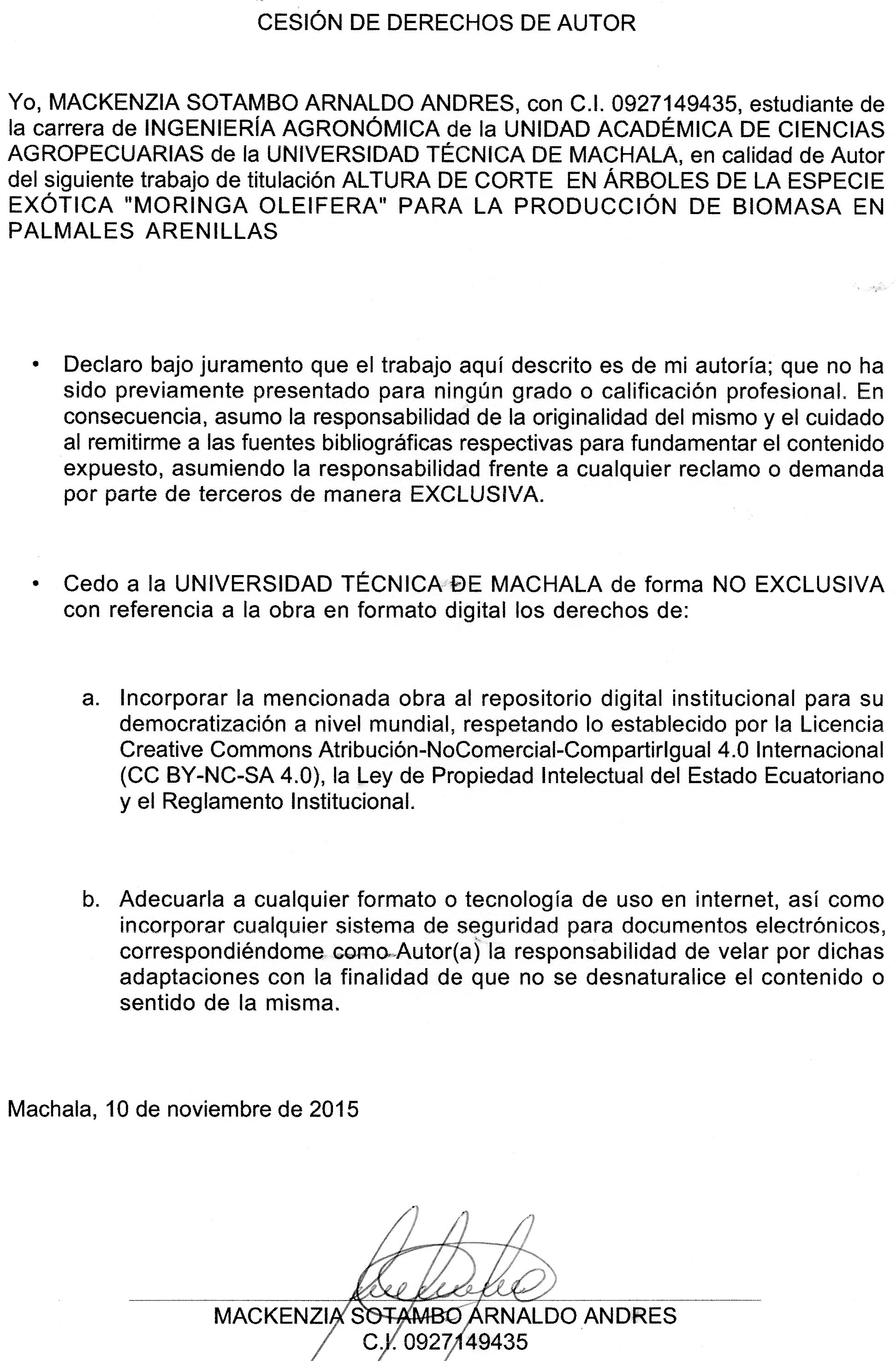 Mackenzia Sotambo, A. A. (2015) Altura de corte en árboles de la especie exótica moringa oleifera para la producción de biomasa en Palmales Arenillas. (Trabajo de titulación). UTMACH, Unidad Académica de Ciencias Agropecuarias, Machala, Ecuador.