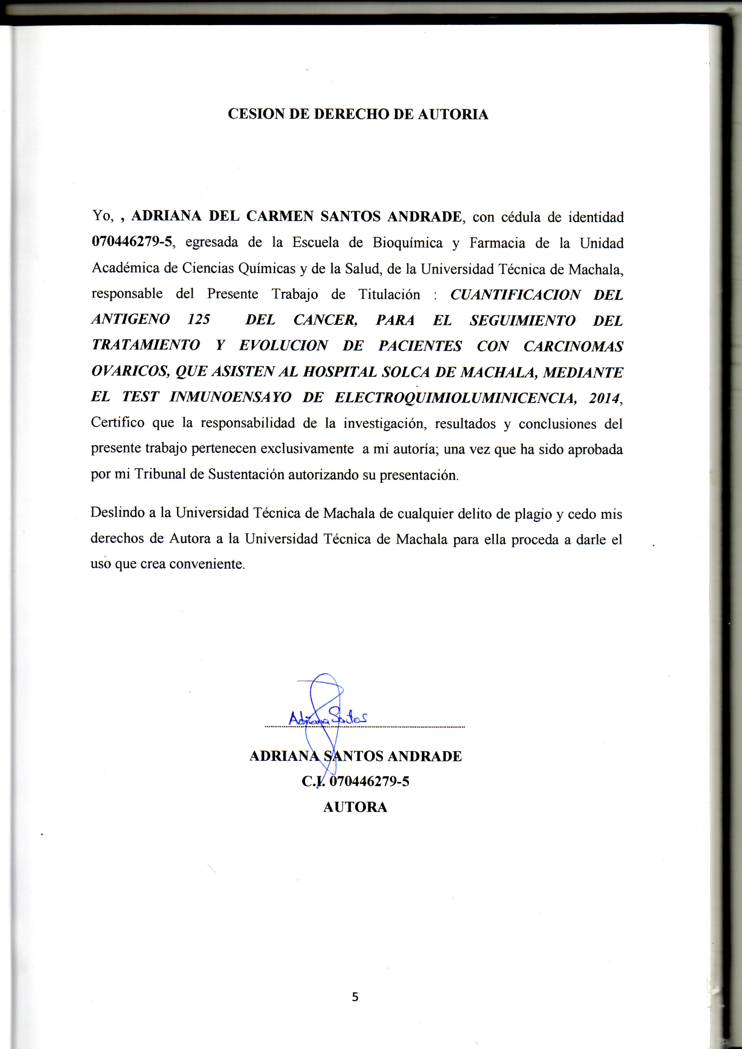 Santos Andrade, A. C. (2014) Cuantificación del antígeno 125 del cáncer, para el seguimiento del tratamiento y evolución de pacientes con carcinomas ováricos, que asisten al Hospital SOLCA de Machala, mediante el test inmunoensayo de electroquimioluminicencia, 2014 (tesis de pregrado). UTMACH, Unidad Académica de Ciencias Química y de la Salud, Machala, Ecuador.