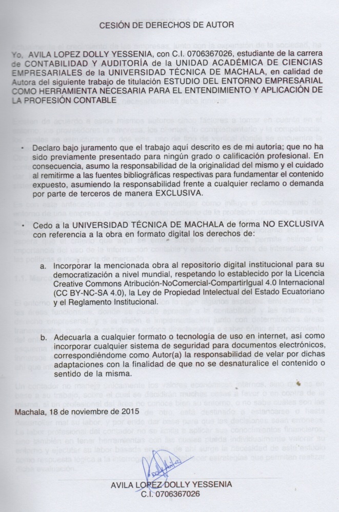 Ávila López, D. Y. (2015). Estudio del entorno empresarial como herramienta necesaria para el entendimiento y aplicación de la profesión contable (Examen complexivo). UTMACH, Unidad Académica de Ciencias Empresariales, Machala, Ecuador.