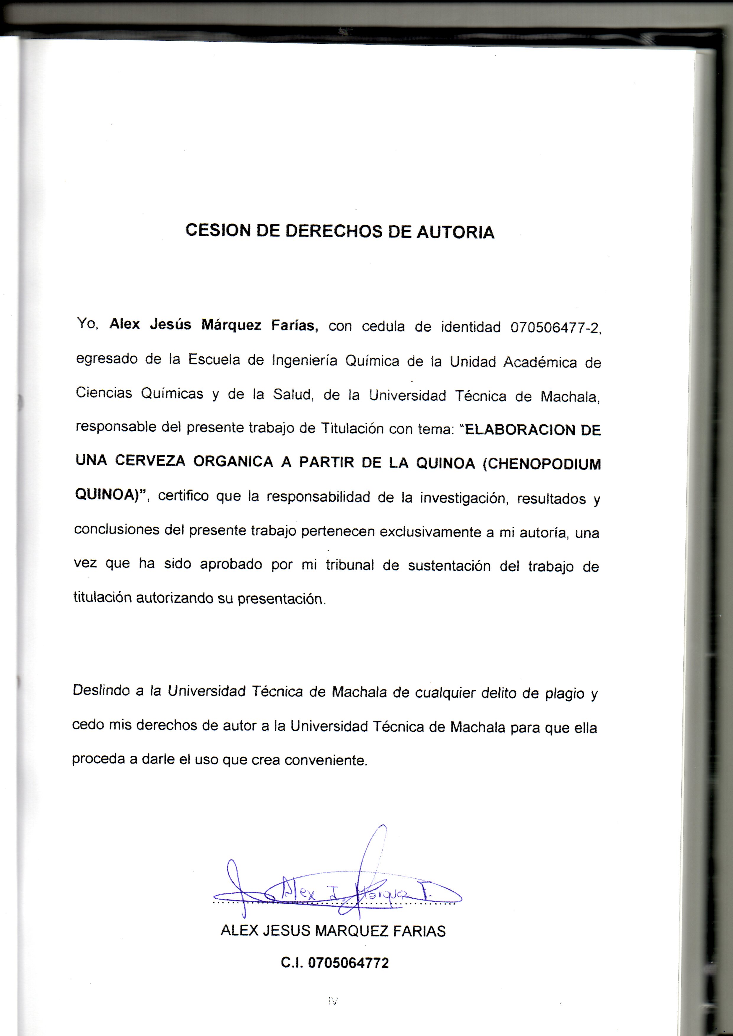 Márquez Farías,A,J.Elaboración de una cerveza orgánica a partir de la quinoa (chenopodium quinoa) . (2015).(trabajo de titulación). UTMACH, Unidad Académica de Ciencias Química y de la Salud, Machala, Ecuador.