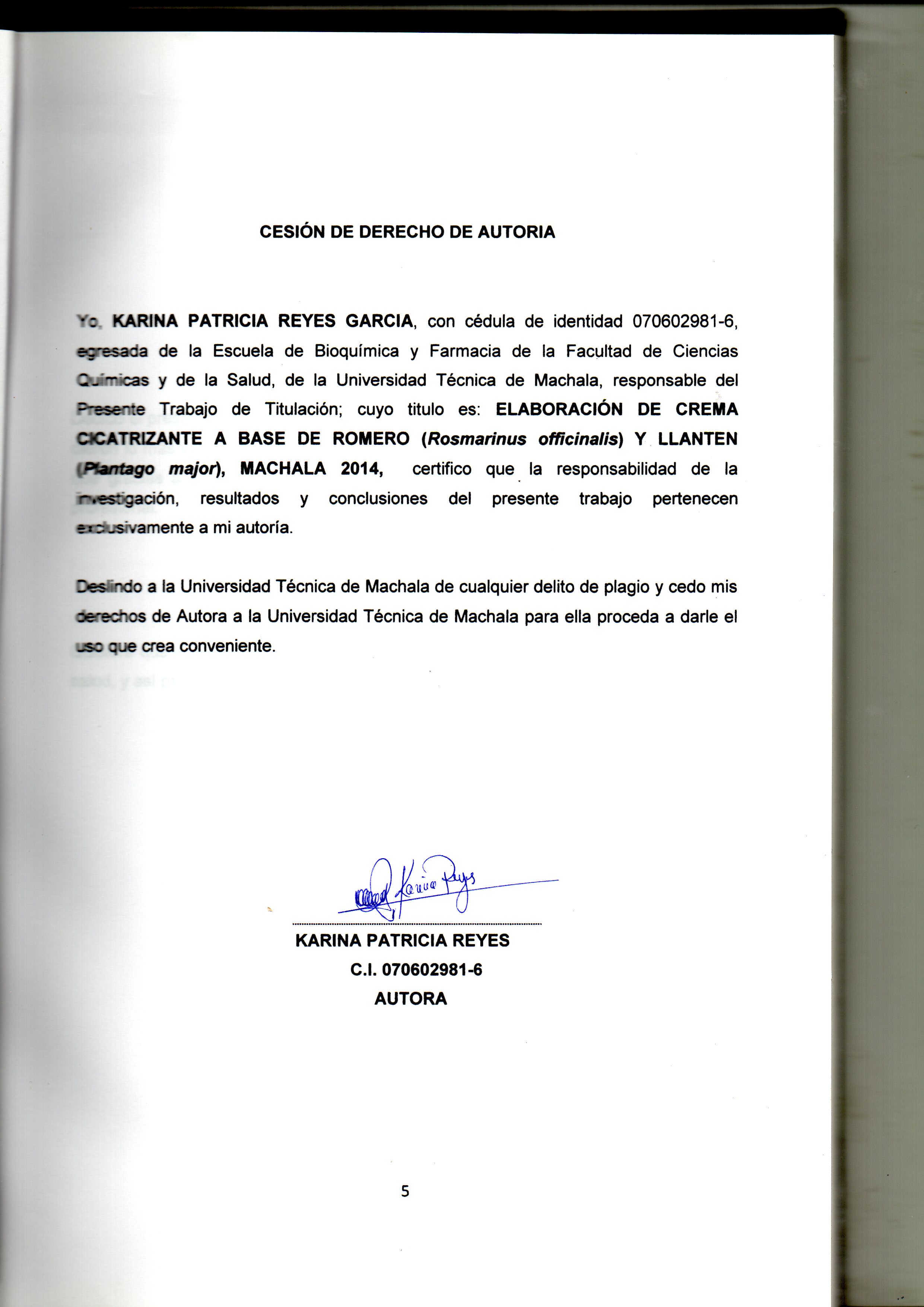 Reyes García, K. P. (2014) Elaboración de crema cicatrizante a base de romero (Rosmarinus officinalis) y llantén (Plantago major), Machala 2014 (tesis de pregrado). UTMACH, Unidad Académica de Ciencias Química y de la Salud, Machala, Ecuador.