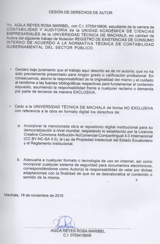 Agila Reyes, R. M. (2015). Registró de existencias de consumo interno de acuerdo a la Normativa Técnica de Contabilidad Gubernamental del sector público (Examen complexivo). UTMACH, Unidad Académica de Ciencias Empresariales, Machala, Ecuador.