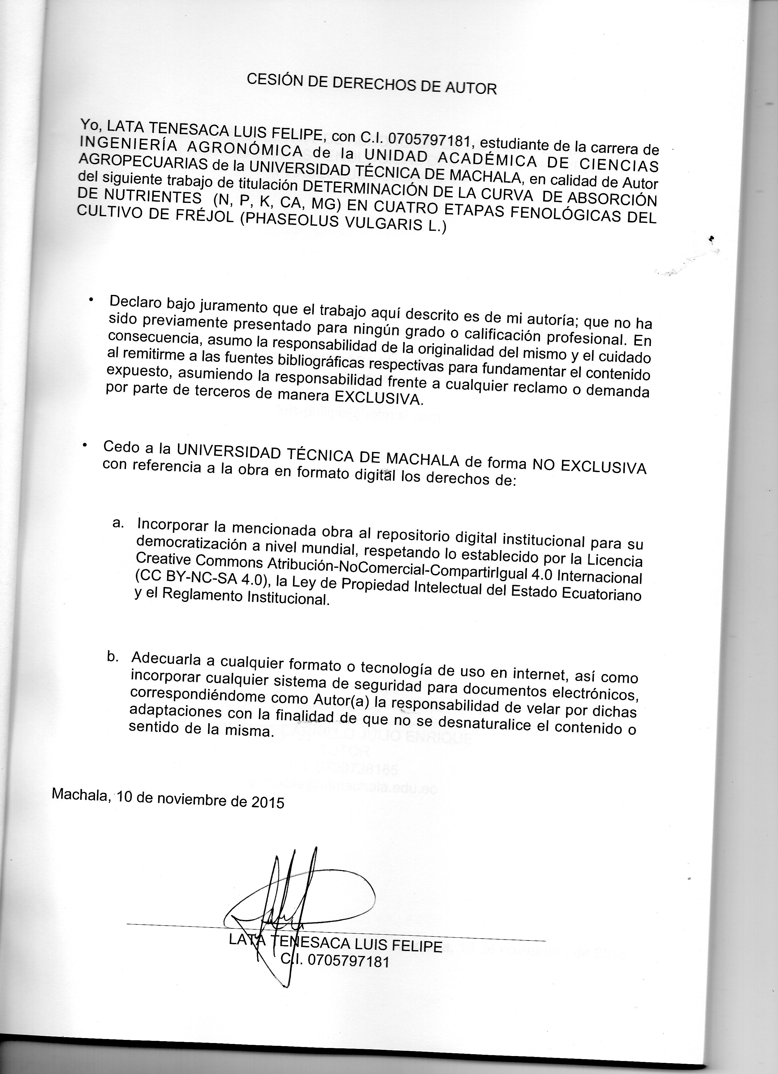 Lata Tenesaca, L. F. (2015) Determinación de la curva de absorción de nutrientes n p k ca mg en cuatro etapas fenológicas del cultivo de fréjol phaseolus vulgaris l. (Trabajo de titulación). UTMACH, Unidad Académica de Ciencias Agropecuarias, Machala, Ecuador.