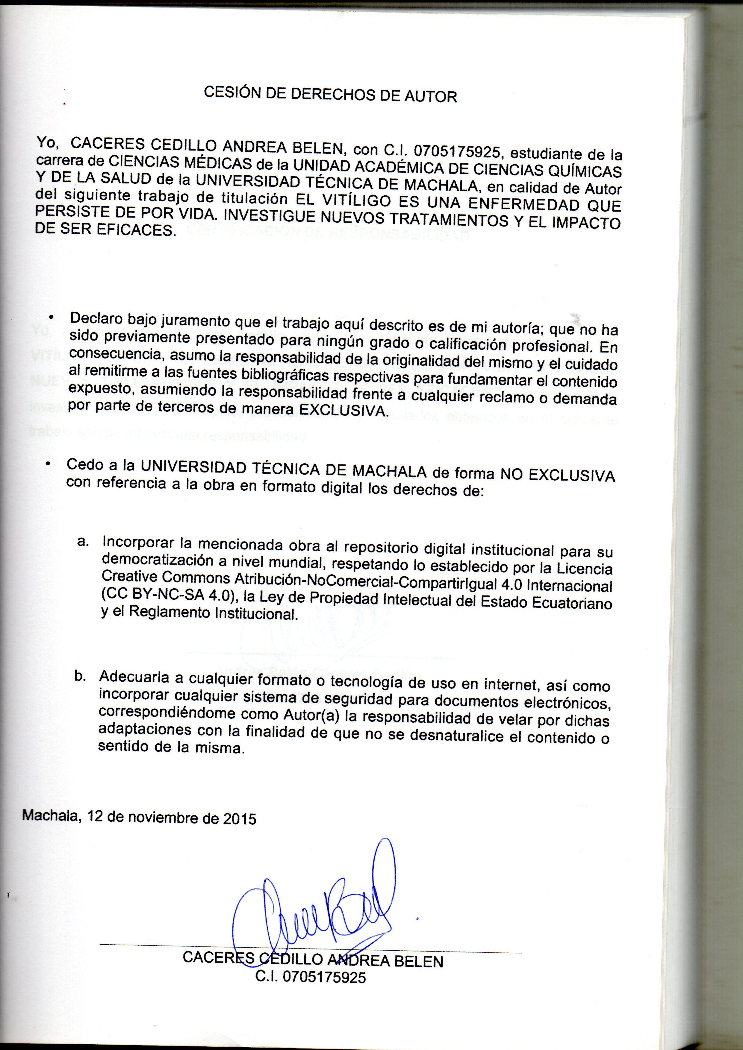 Cáceres Cedillo, A. B. (2015) El Vitíligo es una enfermedad que persiste de por vida. Investigue nuevos tratamientos y el impacto de ser eficaces (Examen complexivo) UTMACH, Unidad Académica de Ciencias Química y de la Salud, Machala, Ecuador.