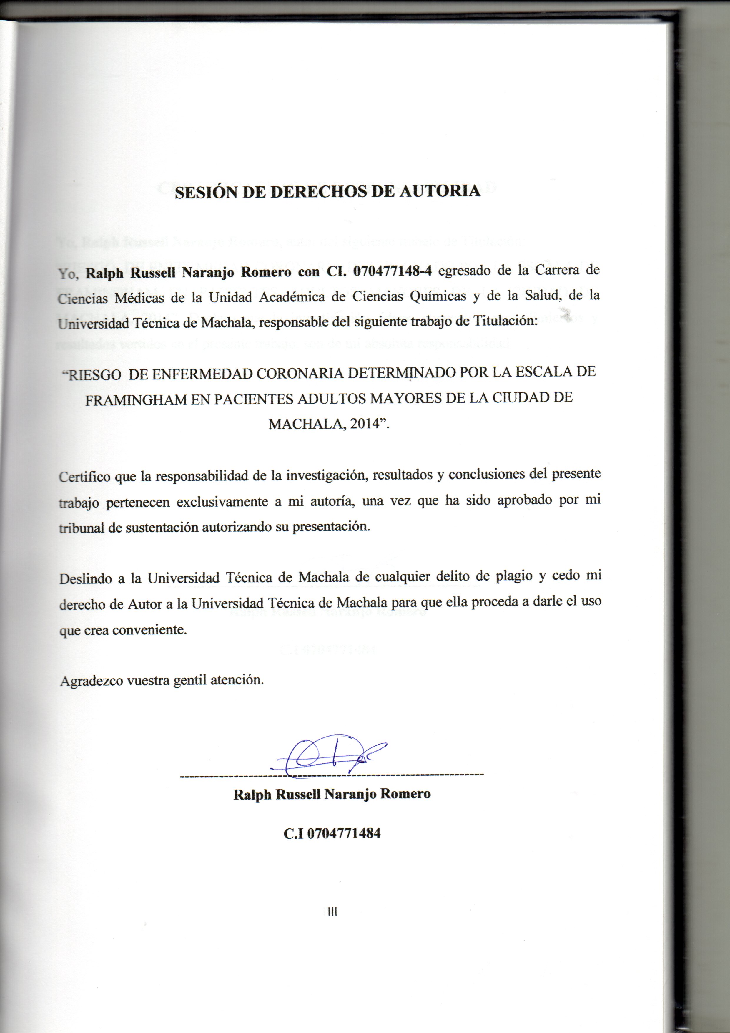 Naranjo Romero, N. R. (2015) Riesgo de enfermedad coronaria determinado por la escala de Framingham en pacientes adultos mayores de la ciudad de Machala, 2014” (Trabajo de titulación). UTMACH, Unidad Académica de Ciencias Química y de la Salud, Machala, Ecuador.
