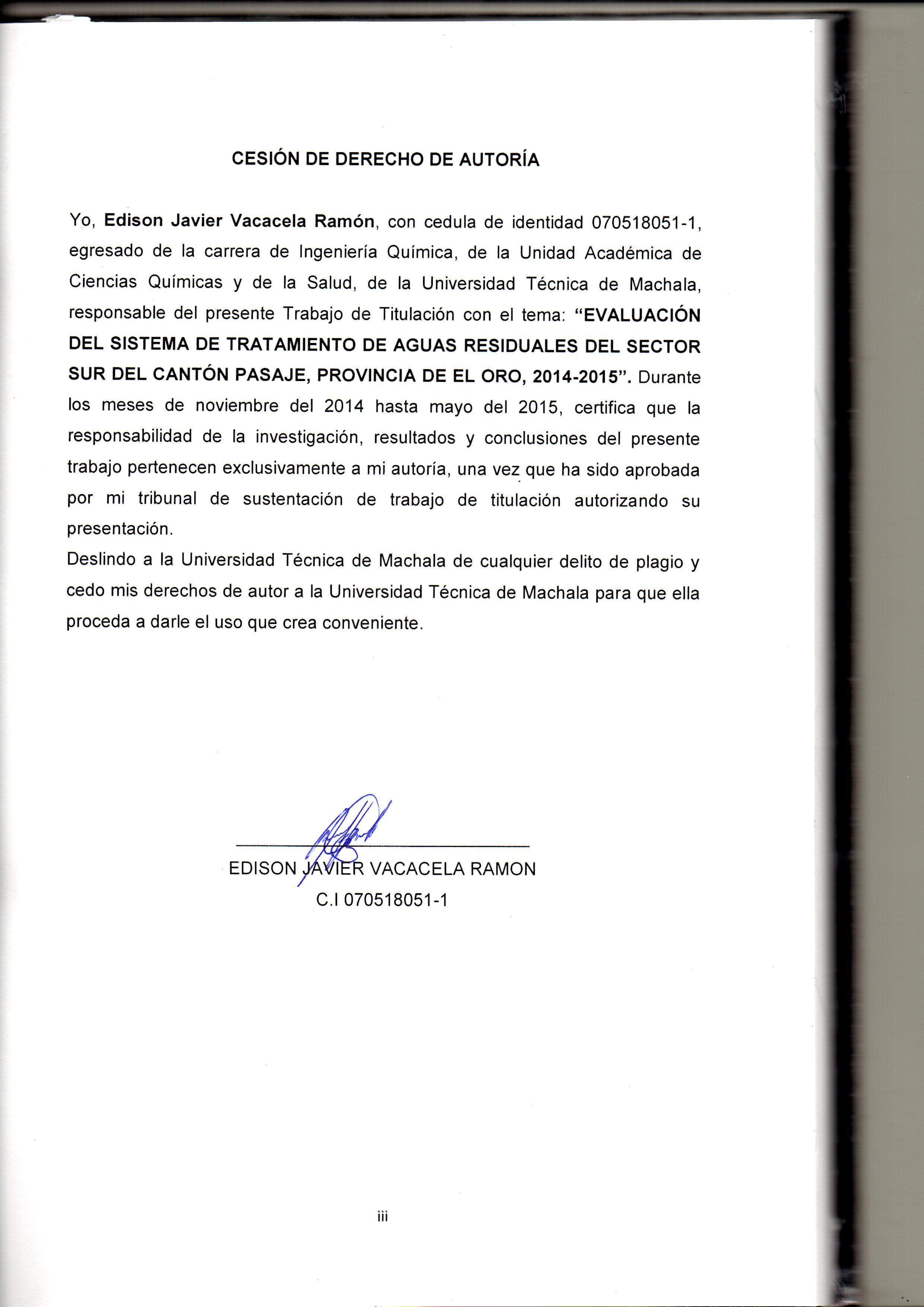Vacacela Ramón, E. J. (2015) Evaluación del sistema de tratamiento de aguas residuales del sector sur del Cantón Pasaje, Provincia de El Oro, 2014-2015 (Trabajo de titulación). UTMACH, Unidad Académica de Ciencias Química y de la Salud, Machala, Ecuador.
