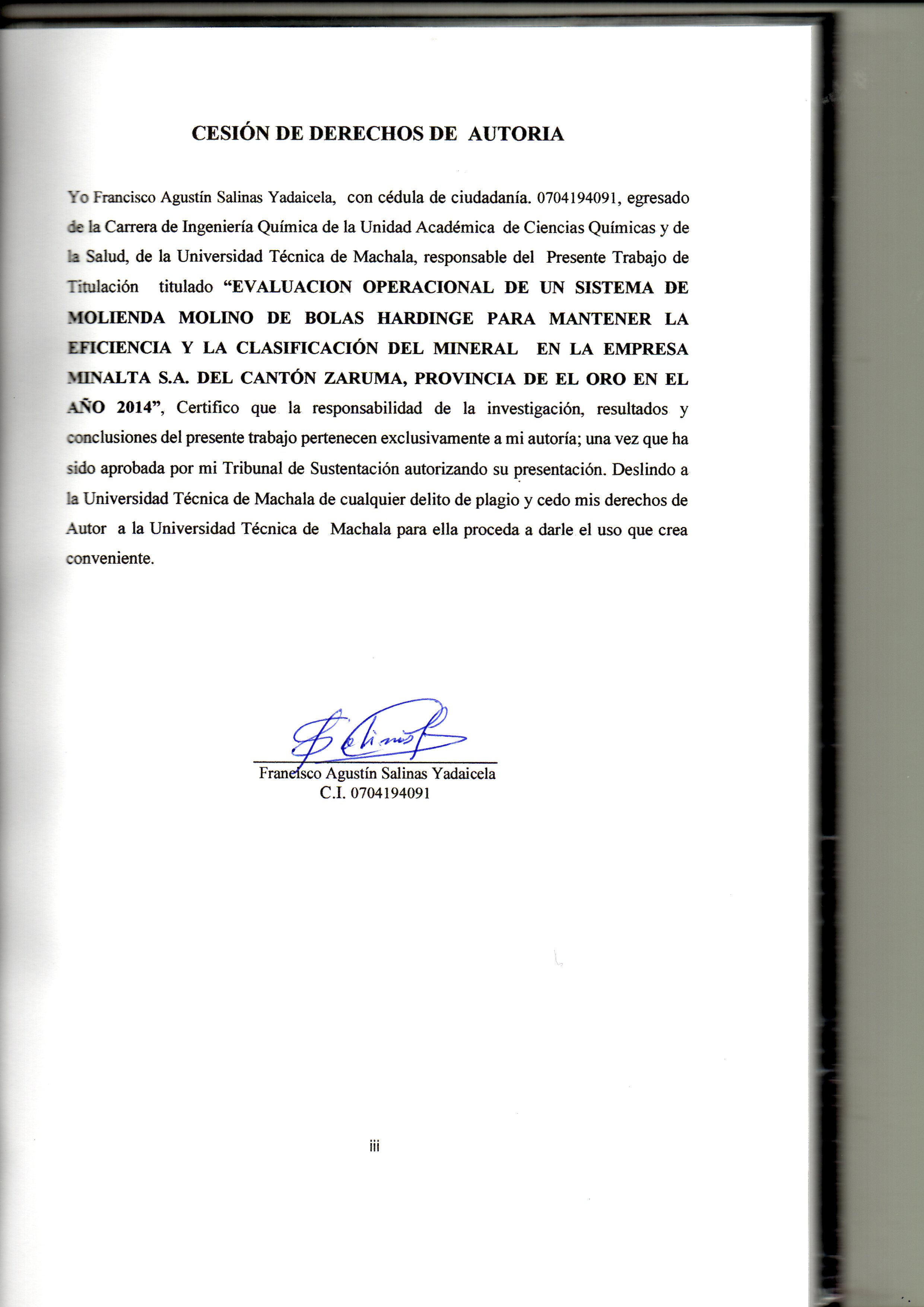 Evaluación operacional de un sistema de molienda molino de bolas hardinge para mantener la eficiencia y la clasificación del mineral en la empresa Minalta S.A del cantón Zaruma , provincia de El Oro, 2014.