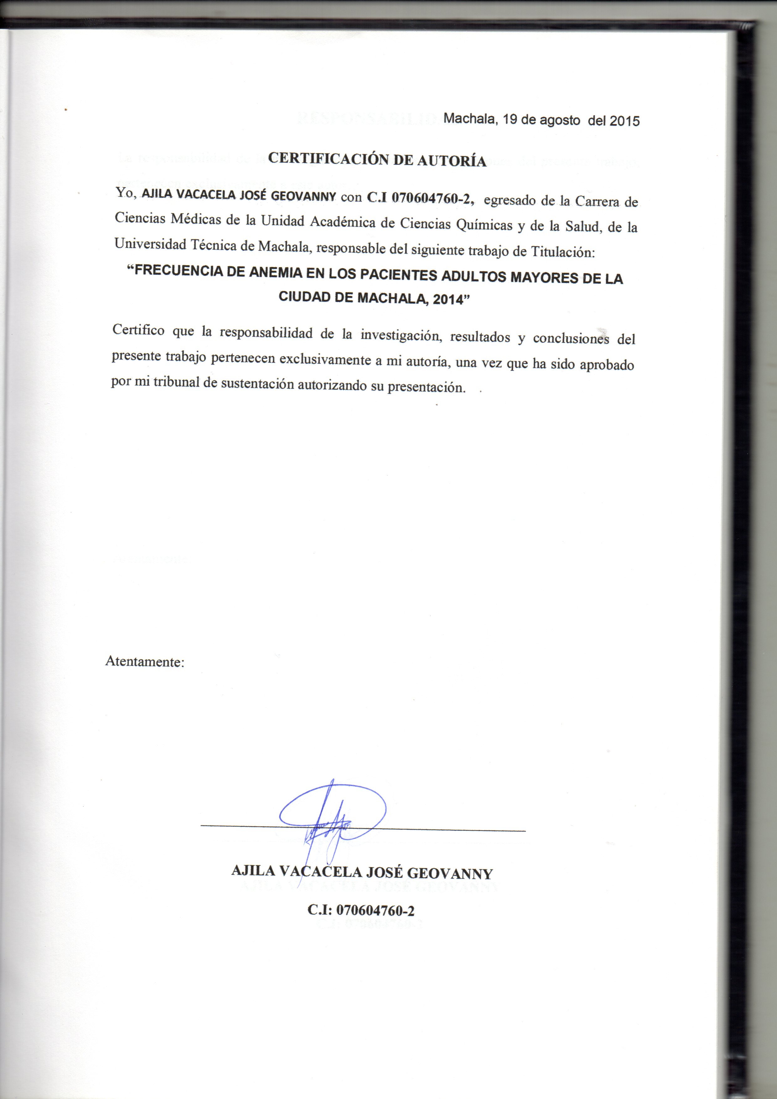 Ajila Vacacela, J. G. (2015) “Frecuencia de anemia en los pacientes adultos mayores de la ciudad de Machala, 2014” (Trabajo de titulación). UTMACH, Unidad Académica de Ciencias Química y de la Salud, Machala, Ecuador.
