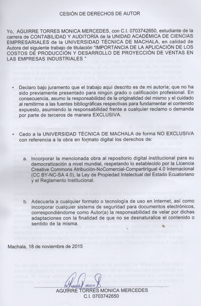 Aguirre Torres,, M. M. (2015). Importancia de la aplicación de los costos de producción y desarrollo de proyección de ventas en las empresas industriales (Examen complexivo). UTMACH, Unidad Académica de Ciencias Empresariales, Machala, Ecuador.