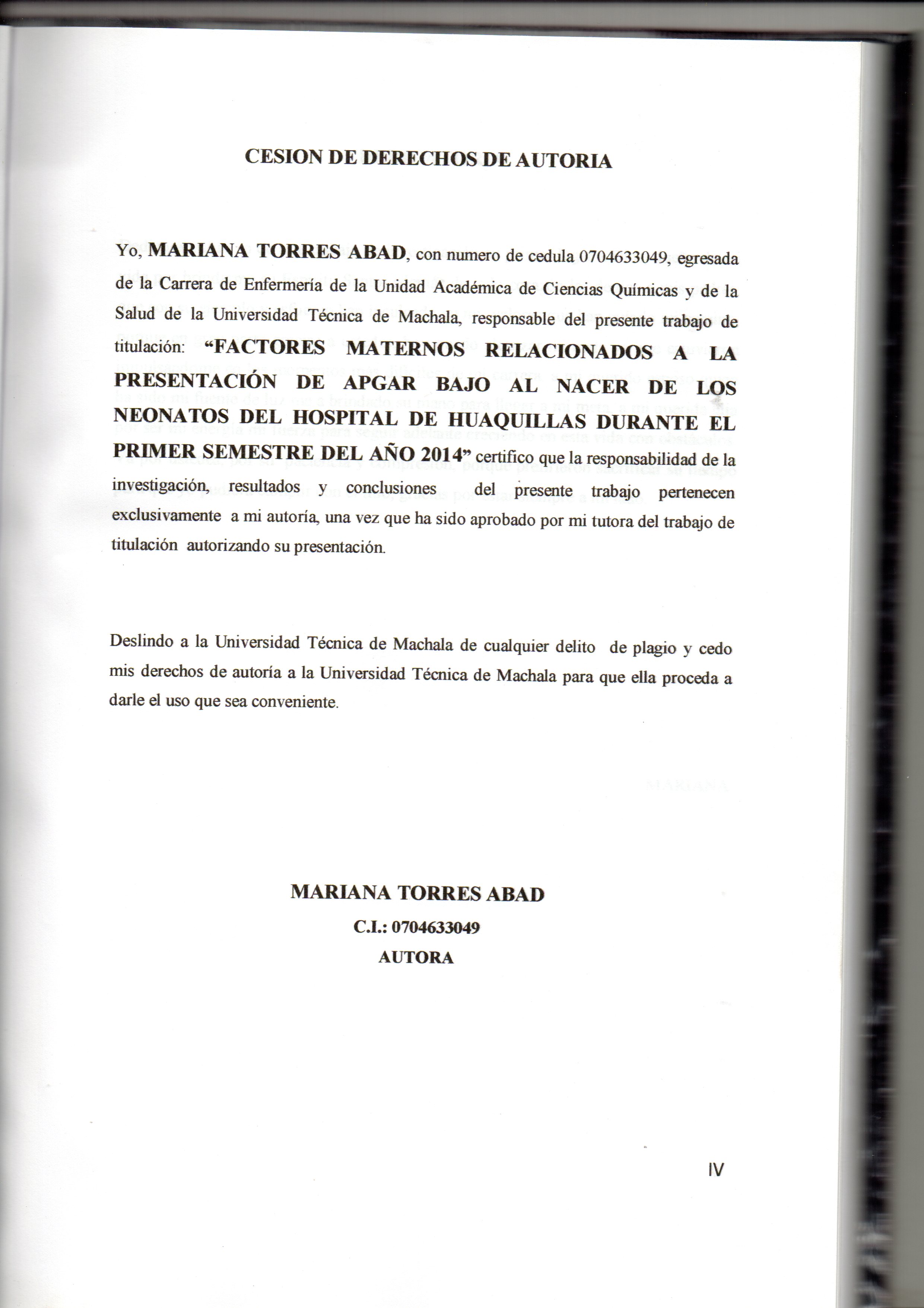 Torres Abad, M. (2015) Factores maternos relacionados a la presentación de apgar bajo al nacer de los neonatos de el Hospital de Huaquillas durante el primer semestre del año 2014. (Trabajo de titulación). UTMACH, Unidad Académica de Ciencias Química y de la Salud, Machala, Ecuador.