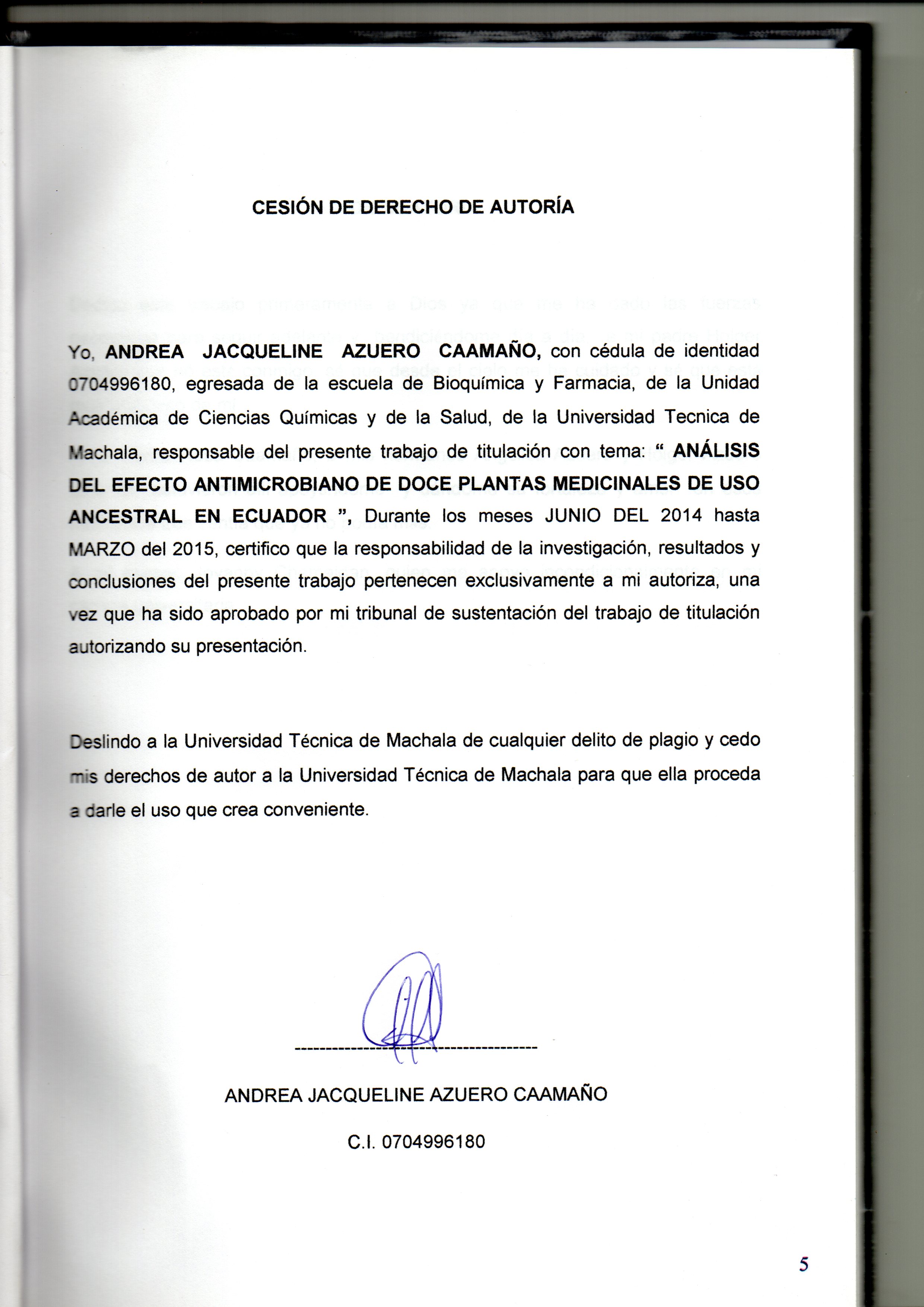 Azuero Caamaño, A. J. (2014) Análisis del efecto antimicrobiano de doce plantas medicinales de uso ancestral en el Ecuador. (Trabajo de titulación). UTMACH, Unidad Académica de Ciencias Química y de la Salud, Machala, Ecuador.
