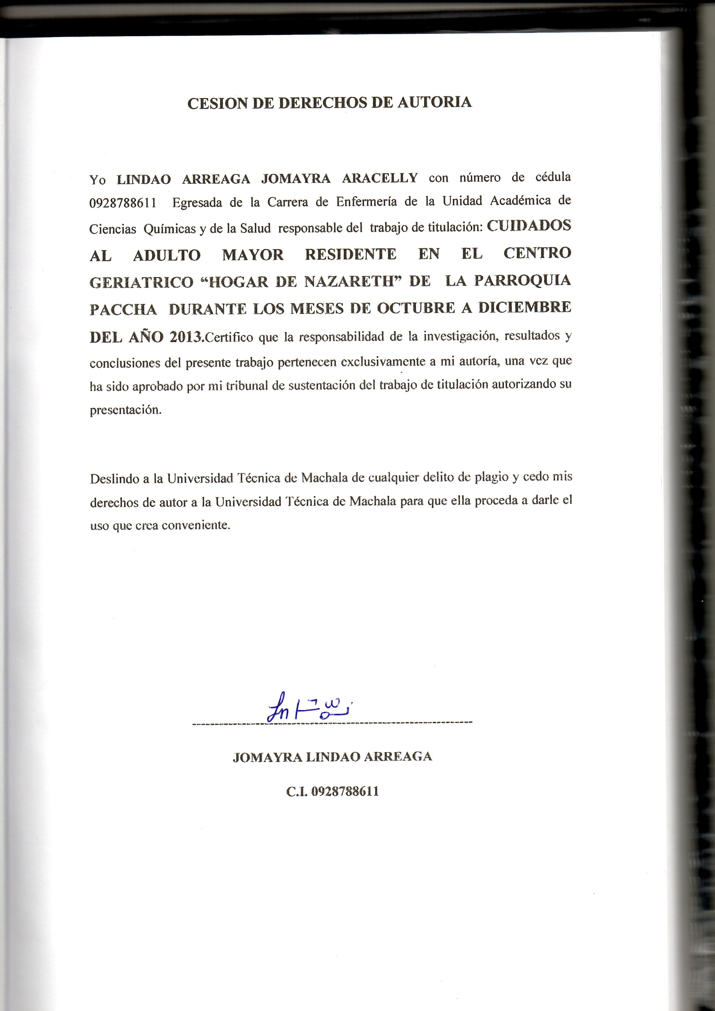 Lindao Arreaga, J. A. (2015).Cuidados al adulto mayor residente en el centro geriatrico "Hogar de Nazaret" de la parroquia Paccha durante los meses de octubre a diciembre del año 2013. (trabajo de titulación). UTMACH, Unidad Académica de Ciencias Química y de la Salud, Machala, Ecuador.