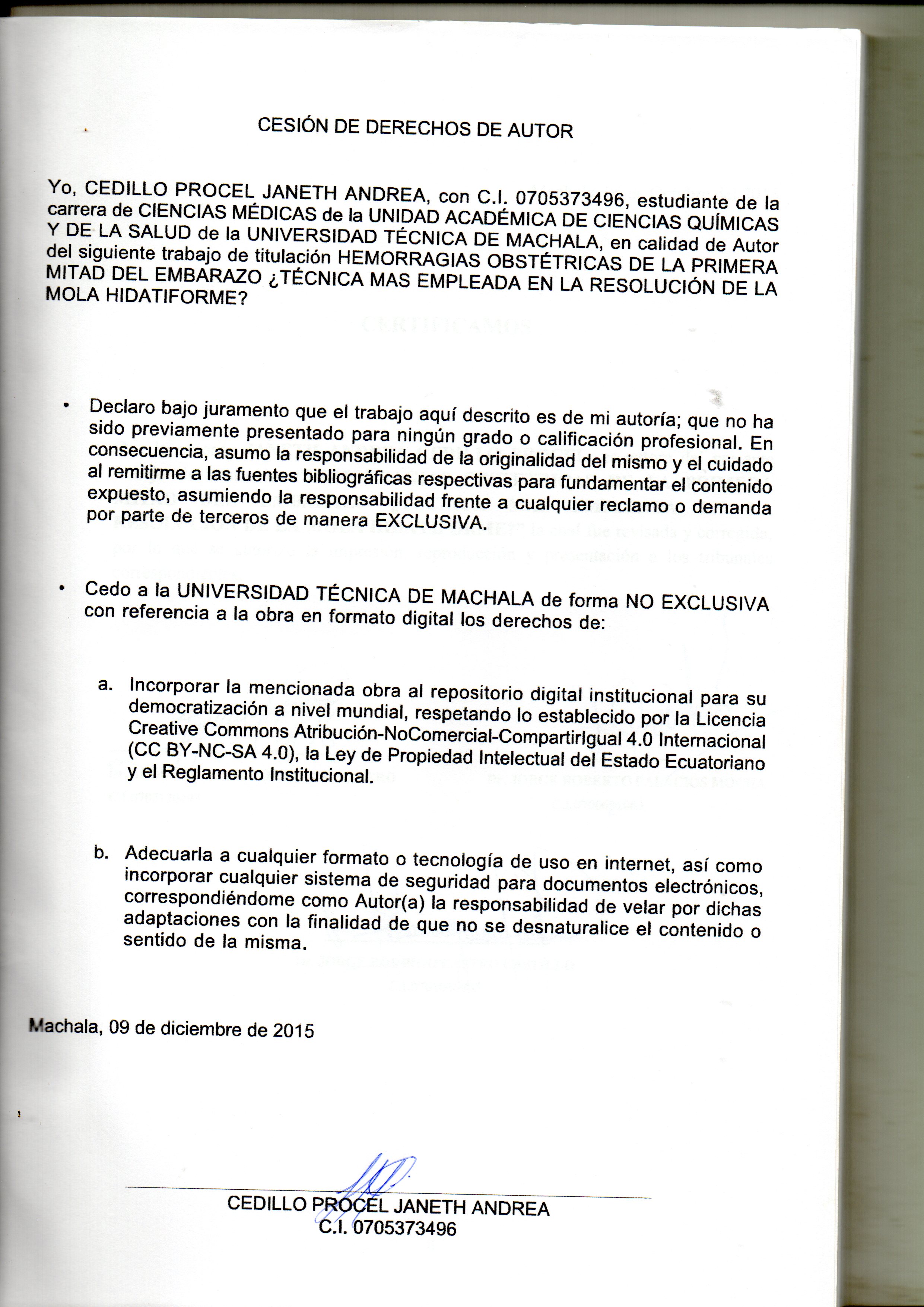 Cedillo Procel, J. A. (2015). Hemorragias obstétricas de la primera mitad del embarazo ¿técnica mas empleada en la resolución de la Mola Hidatiforme?. (Examen complexivo). UTMACH, Unidad Académica de Ciencias Química y de la Salud, Machala, Ecuador.