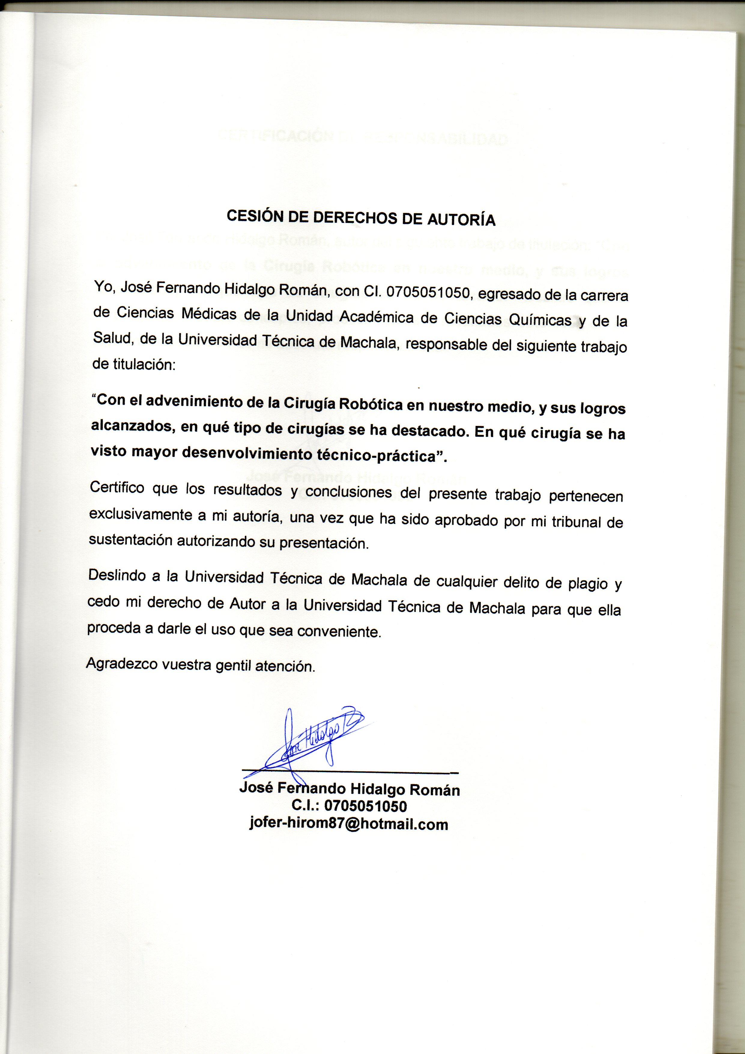 | dc.identifier.citation | Hidalgo Román, H. R. (2015) Con el advenimiento de la Cirugía Robótica en nuestro medio, sus logros alcanzados en que tipos de Cirugía ha destacado. (Examen complexivo). UTMACH, Unidad Académica de Ciencias Química y de la Salud, Machala, Ecuador. | es_ES |