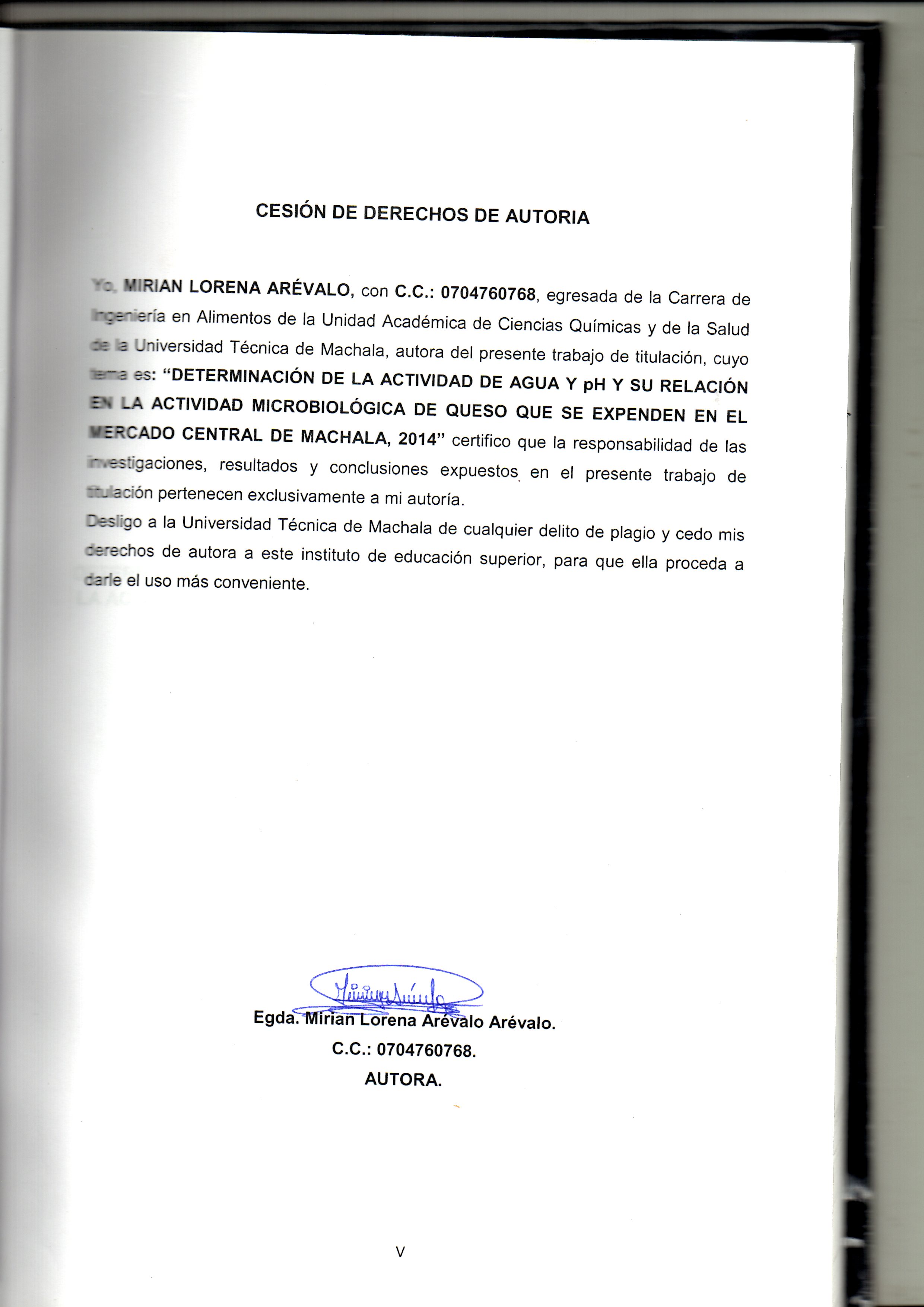 Arévalo Arévalo, M. L. (2014).Determinación de la actividad de agua y PH y su relación en la actividad microbiológica de queso que se expende en el mercado central de Machala ,2014. (trabajo de titulación). UTMACH, Unidad Académica de Ciencias Química y de la Salud, Machala, Ecuador.