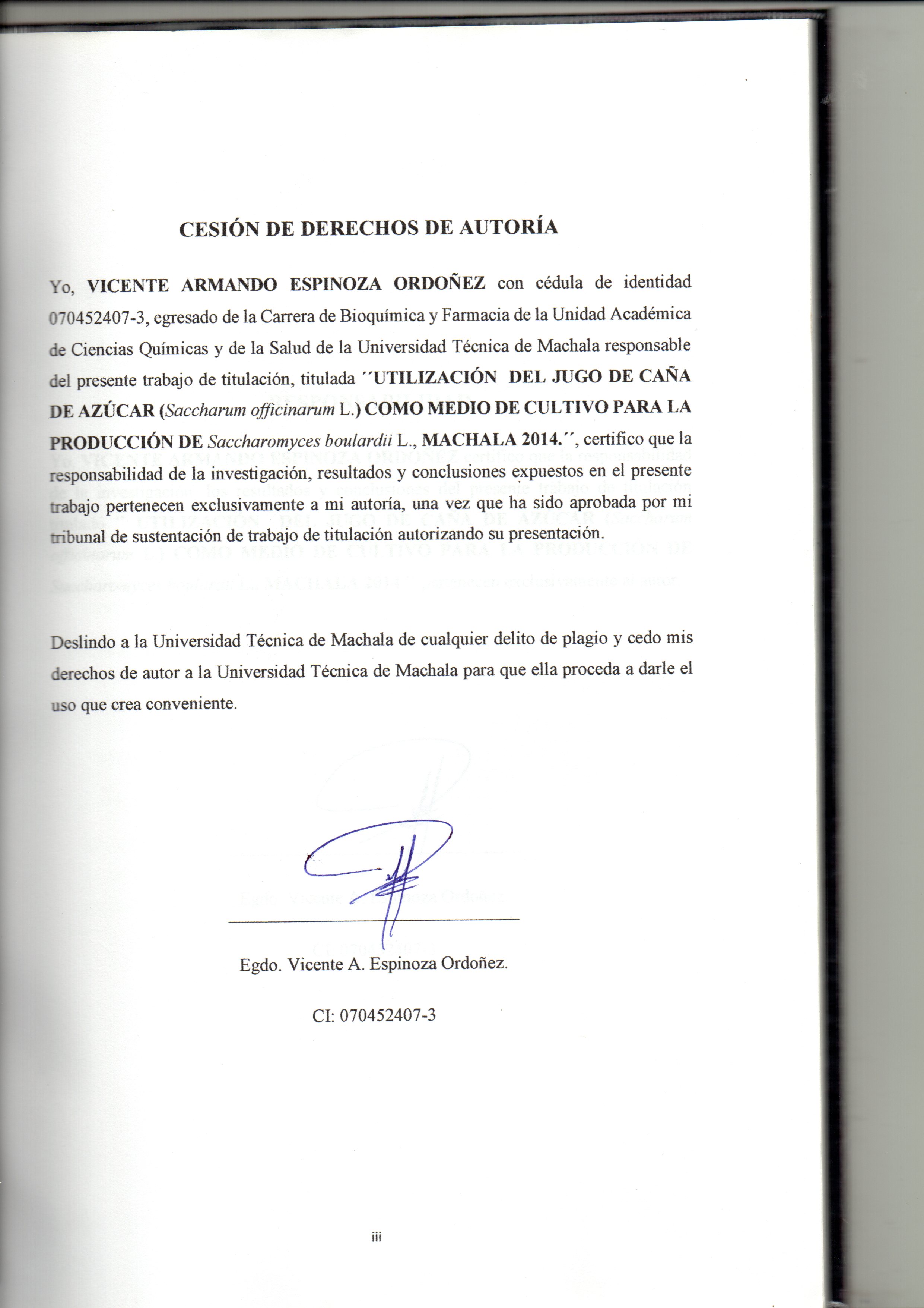 Espinoza Ordoñez,V. A. (2015).Utilización del jugo de caña de azúcar (Saccharum officinarum) como medio de cultivo para la producción de Saccharomyces boulardii L ., Machala 2014.(trabajo de titulación). UTMACH, Unidad Académica de Ciencias Química y de la Salud, Machala, Ecuador.