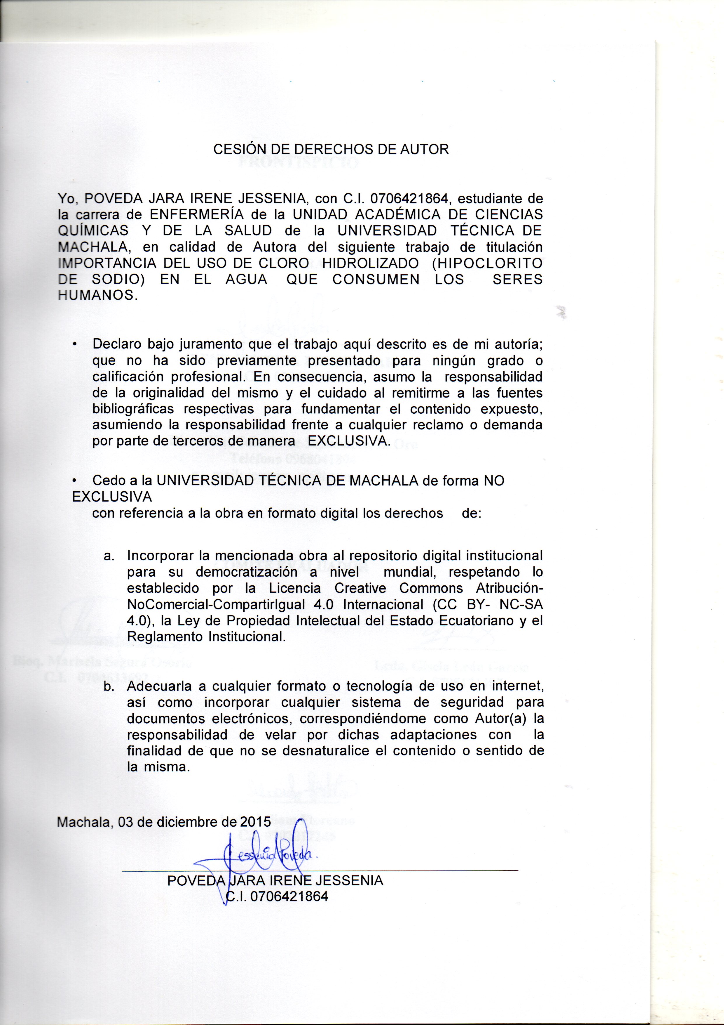 Poveda Jara, I. J. (2015) Importancia del uso de cloro hidrolizado (hipoclorito de sodio) en el agua que consumen los seres humanos. (Examen complexivo). UTMACH, Unidad Académica de Ciencias Química y de la Salud, Machala, Ecuador.