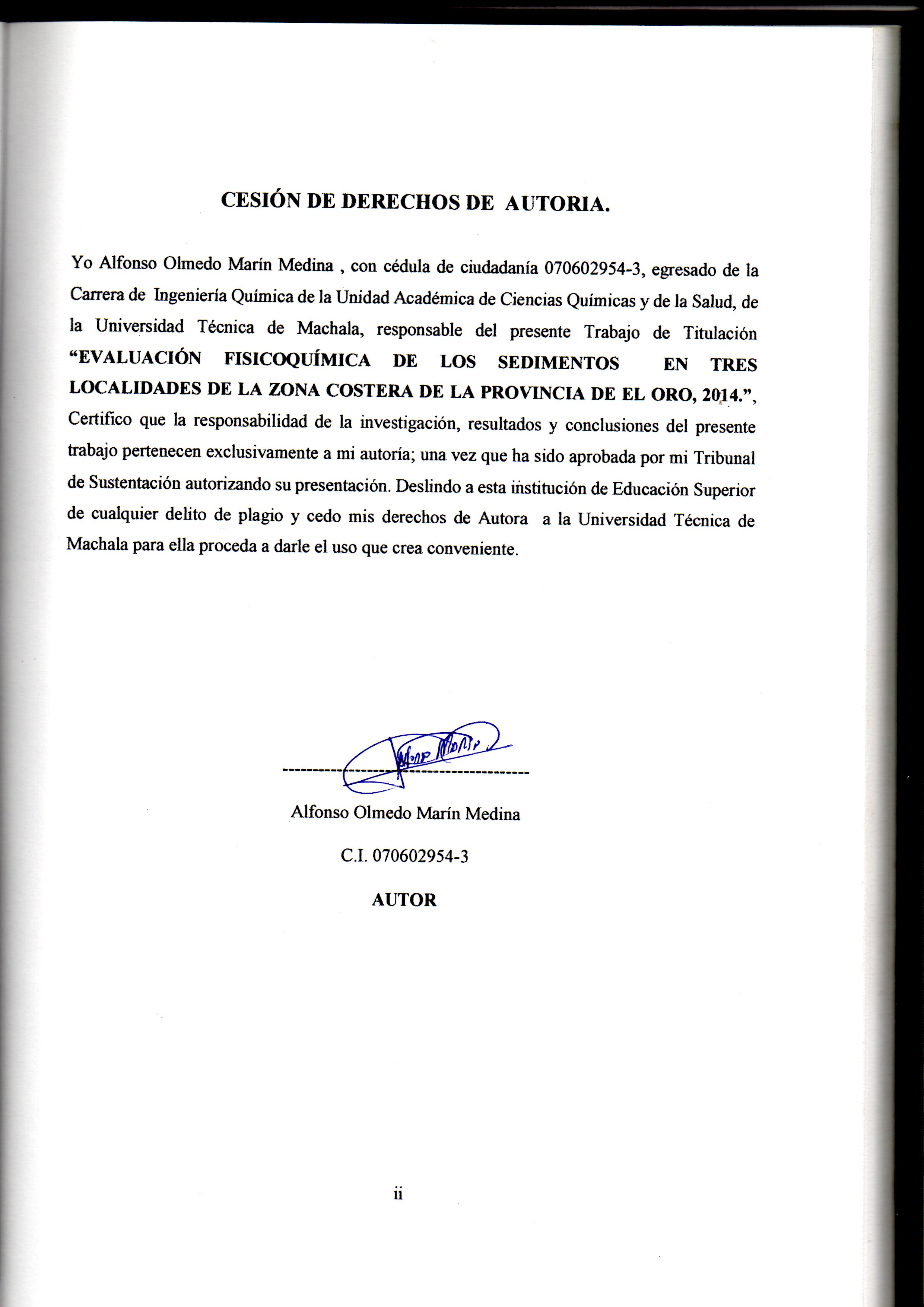 Marín Medina, O. A. (2015) Evaluación fisicoquímica de los sedimentos en tres localidades de la zona costera de la provincia de el Oro, 2014. (Trabajo de titulación). UTMACH, Unidad Académica de Ciencias Química y de la Salud, Machala, Ecuador.