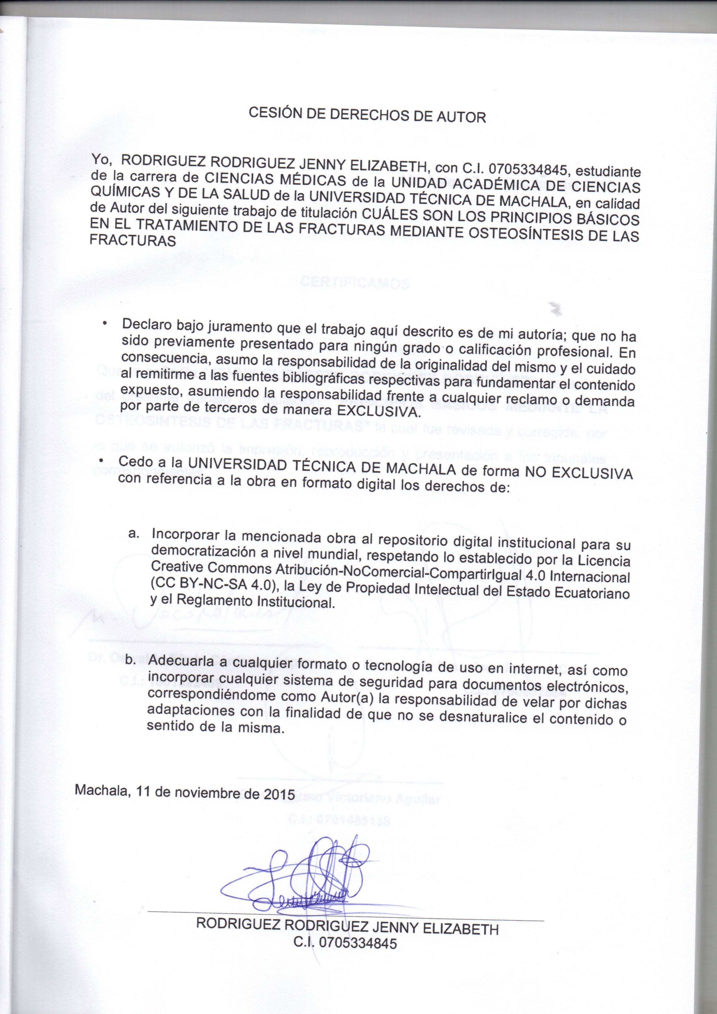 Rodriguez Rodriguez , J. E. (2015) Cuáles son los principios Básicos en el tratamiento de las fracturas mediante osteosíntesis de las fracturas.(Examen complexivo). UTMACH, Unidad Académica de Ciencias Química y de la Salud, Machala, Ecuador.
