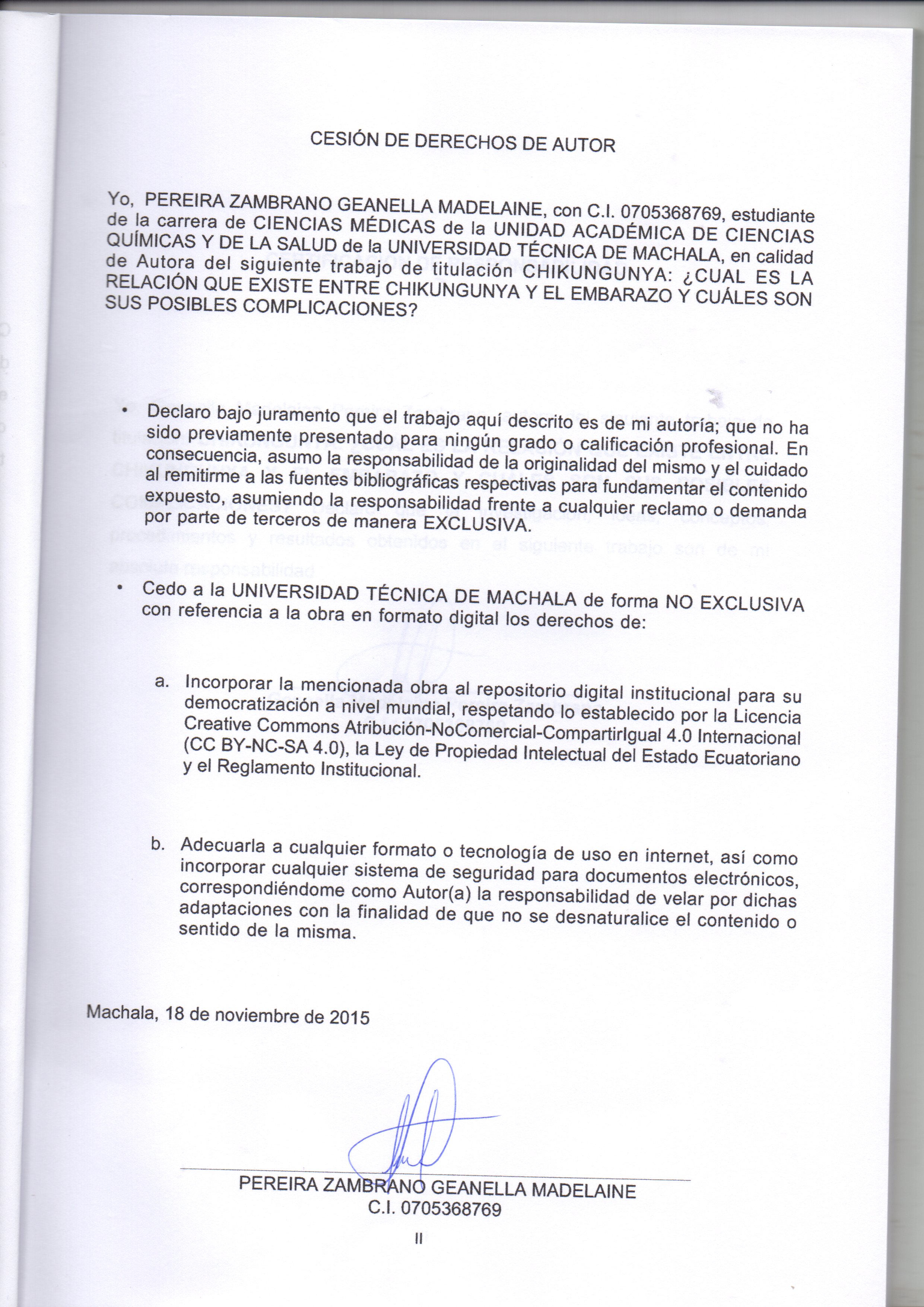 Pereira Zambrano, G. M. (2015) Chikungunya: ¿Cuál es la relación que existe entre Chikungunya y el embarazo y cuáles son sus posibles complicaciones? (Examen complexivo) UTMACH, Unidad Académica de Ciencias Química y de la Salud, Machala, Ecuador.
