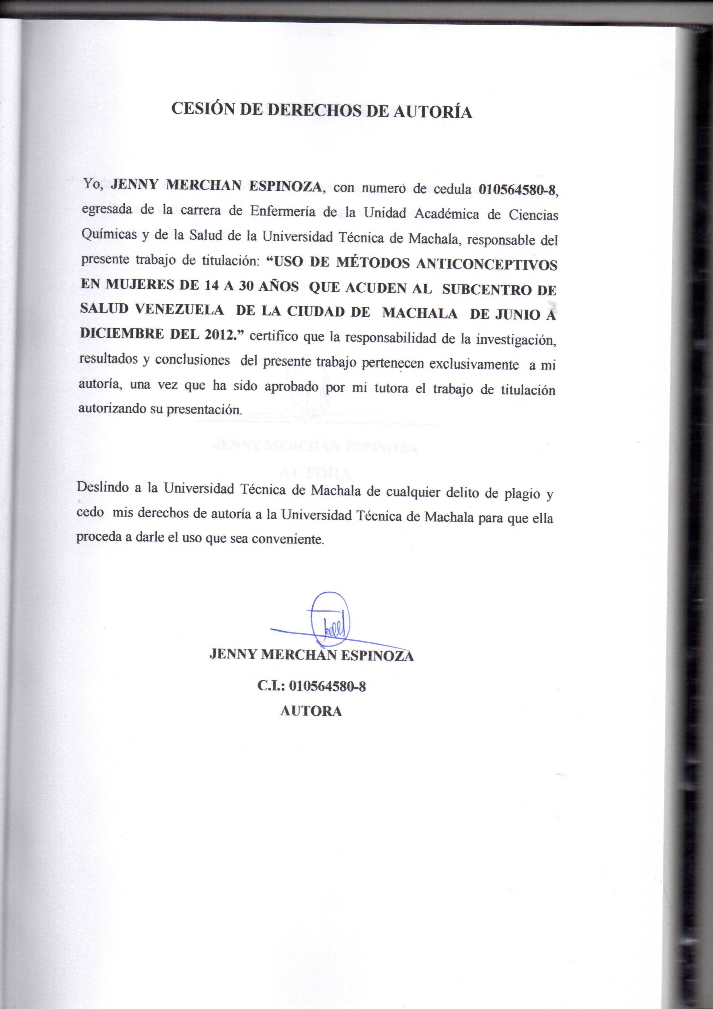 Merchán Espinoza, J. (2015) Uso de métodos anticonceptivos en mujeres de 14 a 30 años que acuden al Subcentro de Salud Venezuela de la Ciudad de Machala de Junio a Diciembre del 2012 (Trabajo de titulación) UTMACH, Unidad Académica de Ciencias Química y de la Salud, Machala, Ecuador.