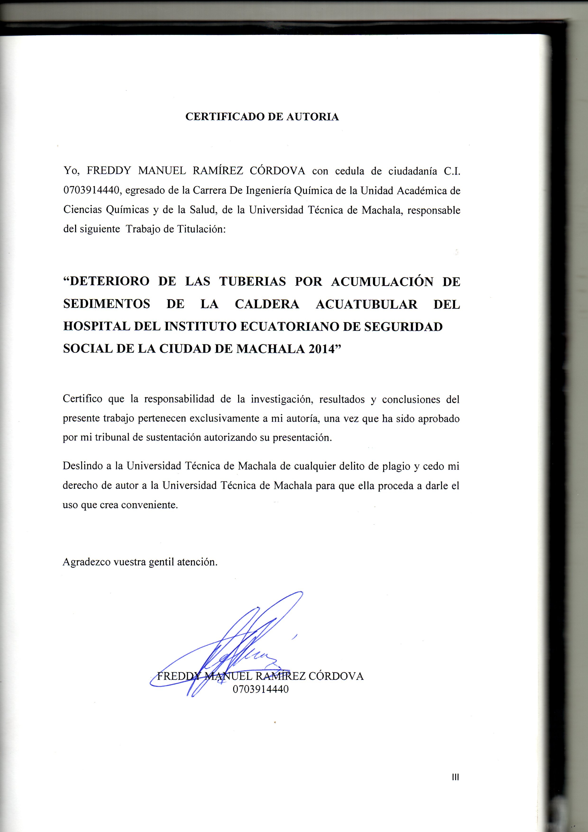 Ramírez Córdova, F. (2014). Deterioro de las tuberías por acumulación de sedimentos de la caldera acuatubular del Hospital del Instituto Ecuatoriano de Seguridad Social de la ciudad de Machala 2014 (tesis de pregrado). UTMACH, Unidad Académica de Ciencias Química y de la Salud, Machala, Ecuador.