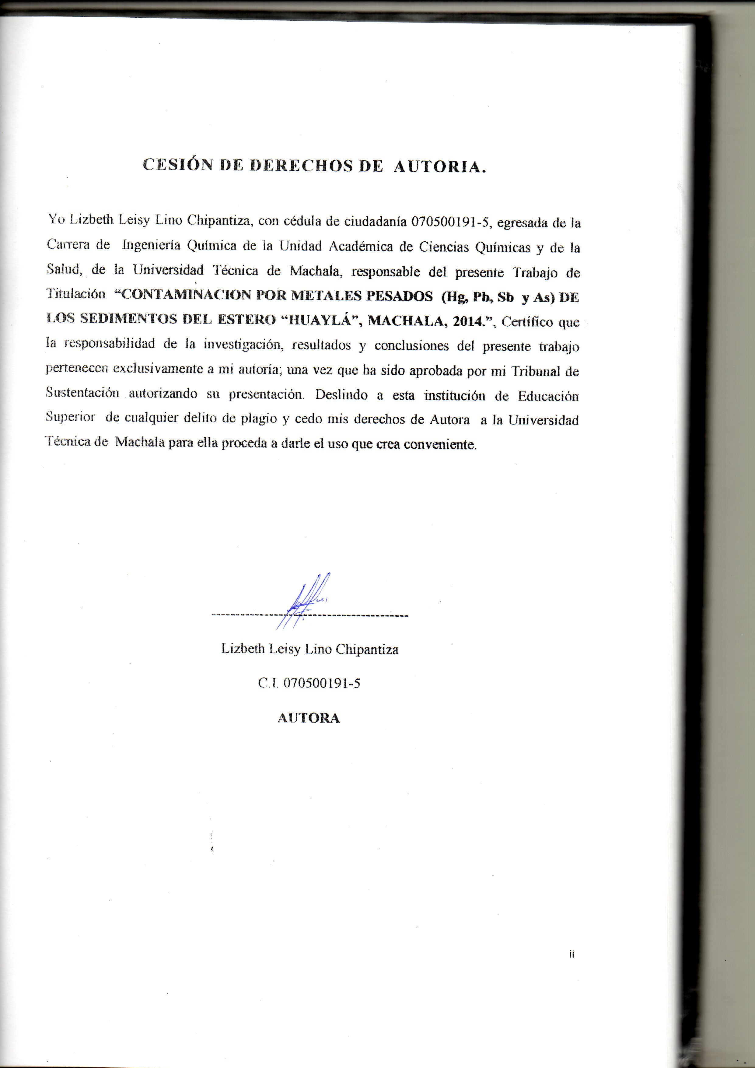 Lino Chipantiza, L. L. (2014). Contaminación por metales pesados (Hg, Pb, Sb y As) de los sedimentos del Estero Huaylá, Machala, 2014 (tesis de pregrado). UTMACH, Unidad Académica de Ciencias Química y de la Salud, Machala, Ecuador.