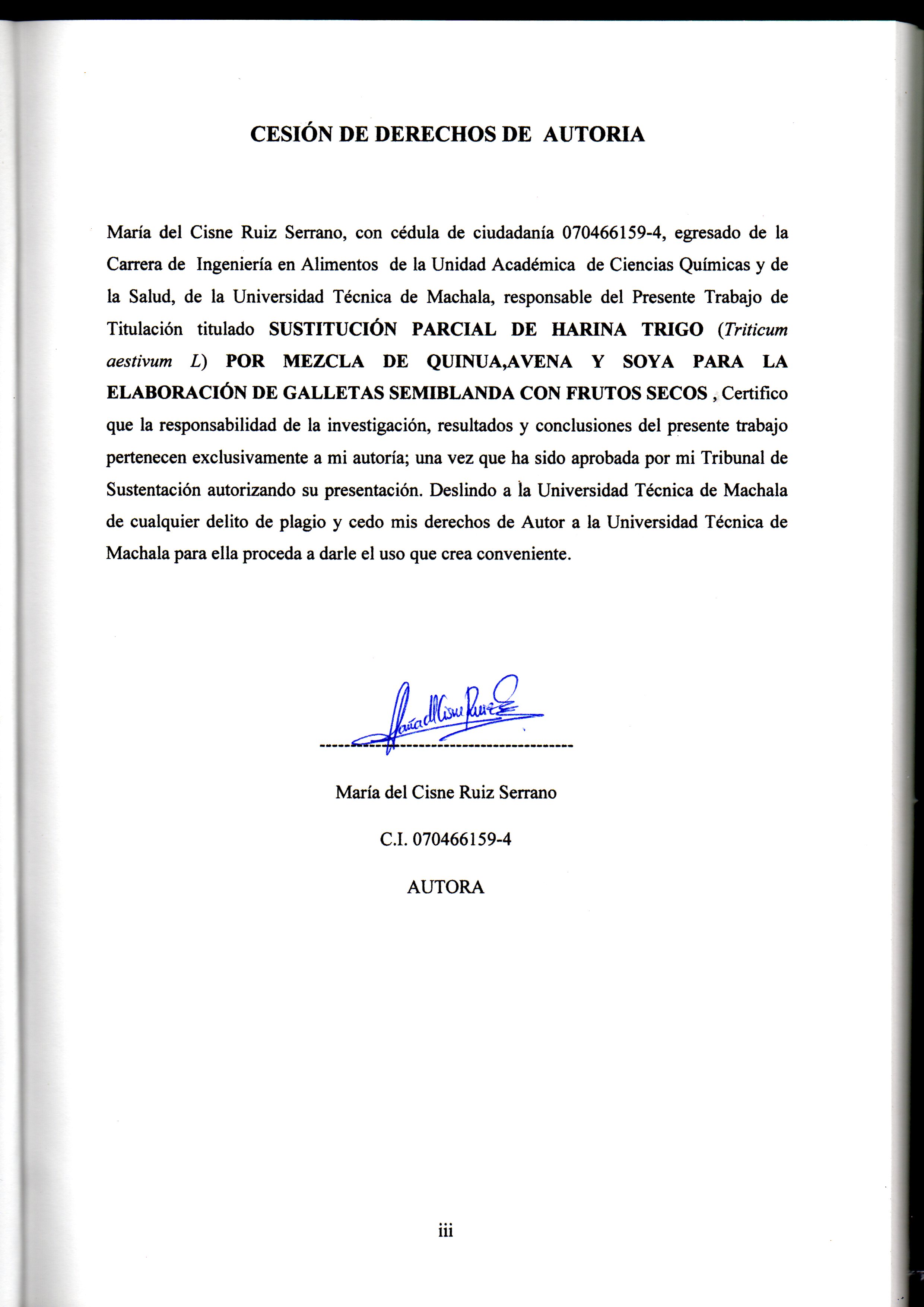 Ruiz Serrano, M. C. (2015) Sustitución parcial de harina de Trigo (Triticum Aestivum L) por mezcla de Quinua, Avena y Soya para la elaboración de galletas semiblanda con frutos secos. (Trabajo de titulación) UTMACH, Unidad Académica de Ciencias Química y de la Salud, Machala, Ecuador.