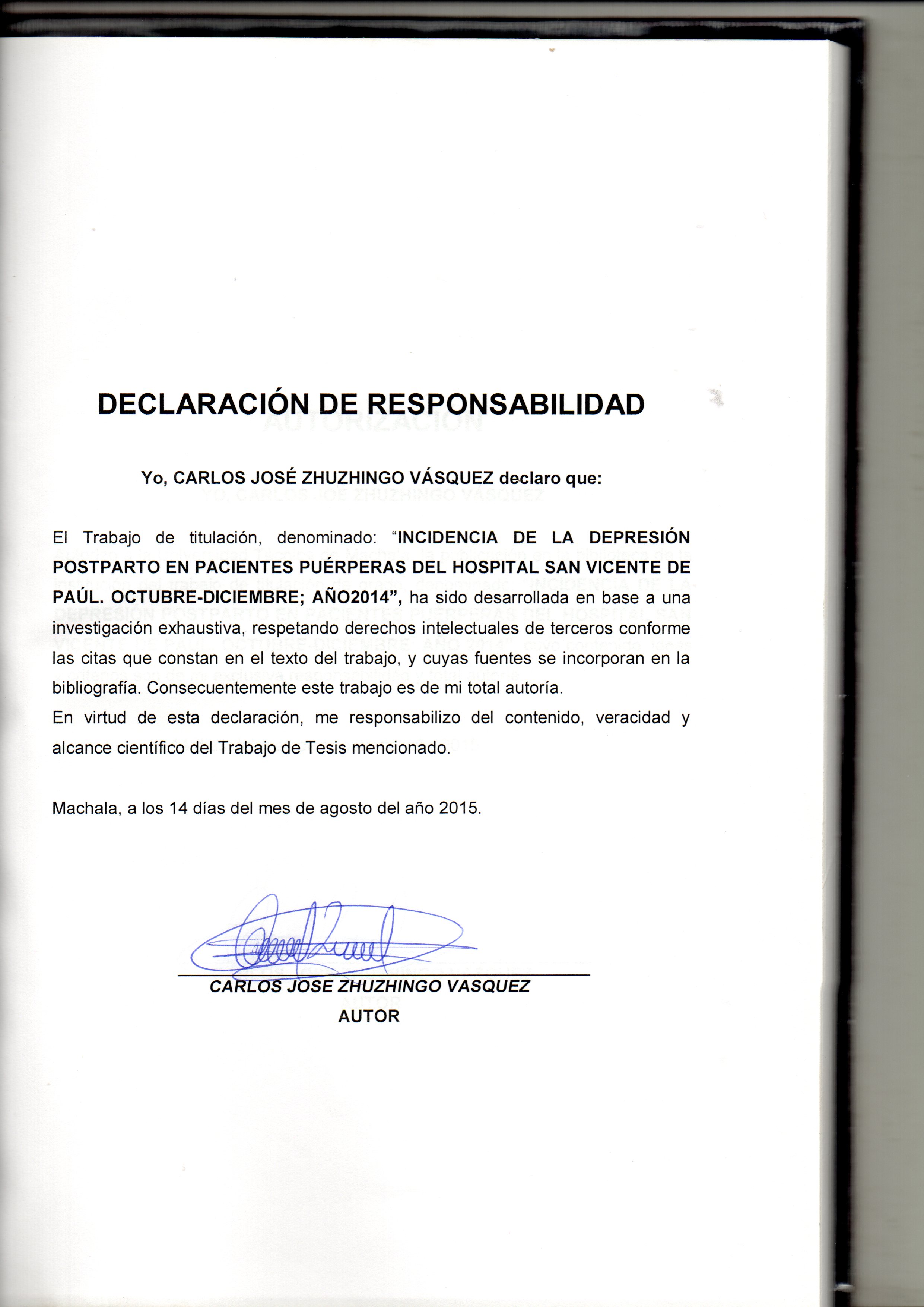 Zhuzhingo Vásquez, C . J. (2015) Incidencia de la depresión postparto en pacientes puérperas del Hospital San Vicente de Paúl. (octubre-diciembre año 2014) (Trabajo de titulación) UTMACH, Unidad Académica de Ciencias Química y de la Salud, Machala, Ecuador.
