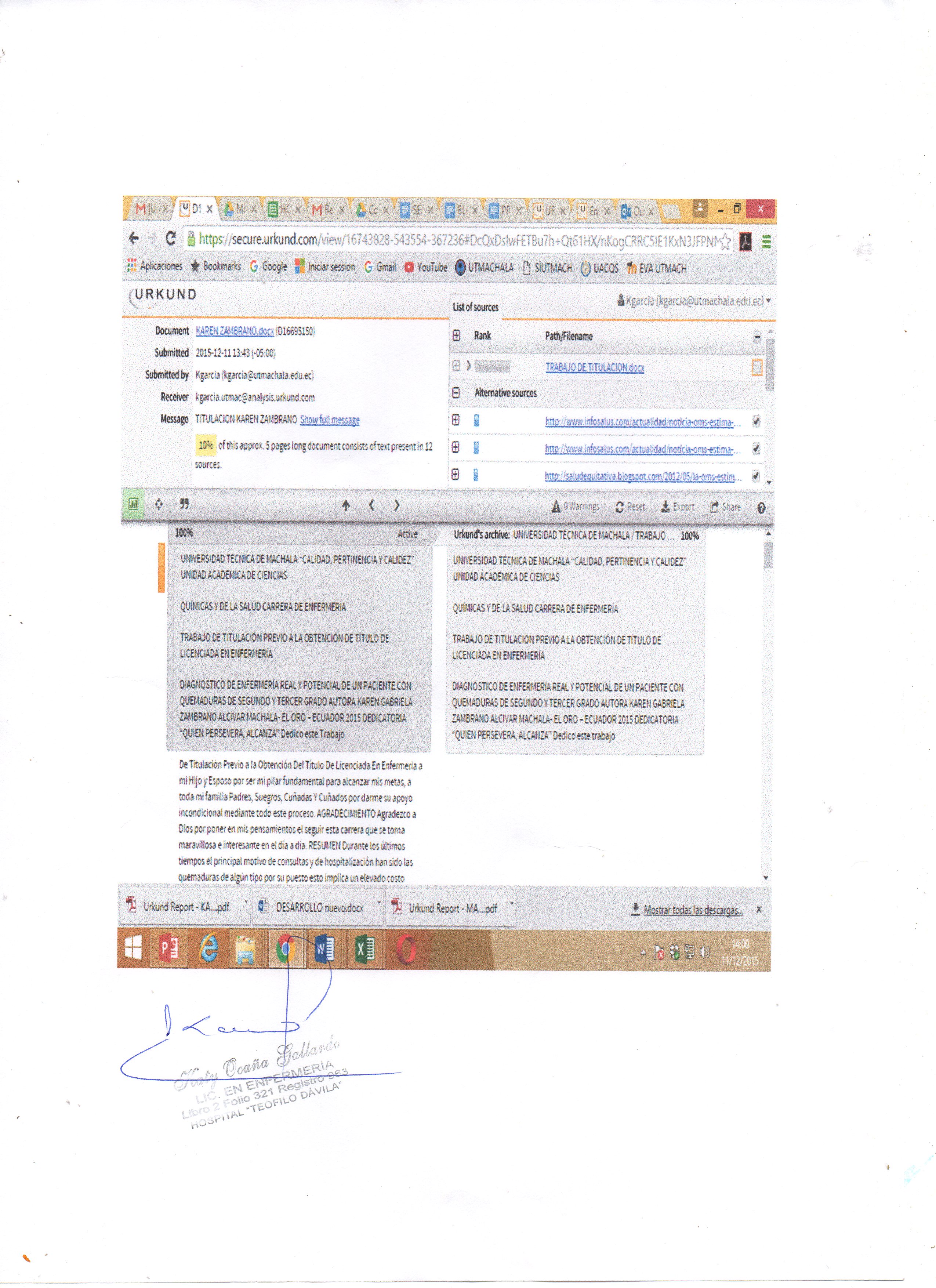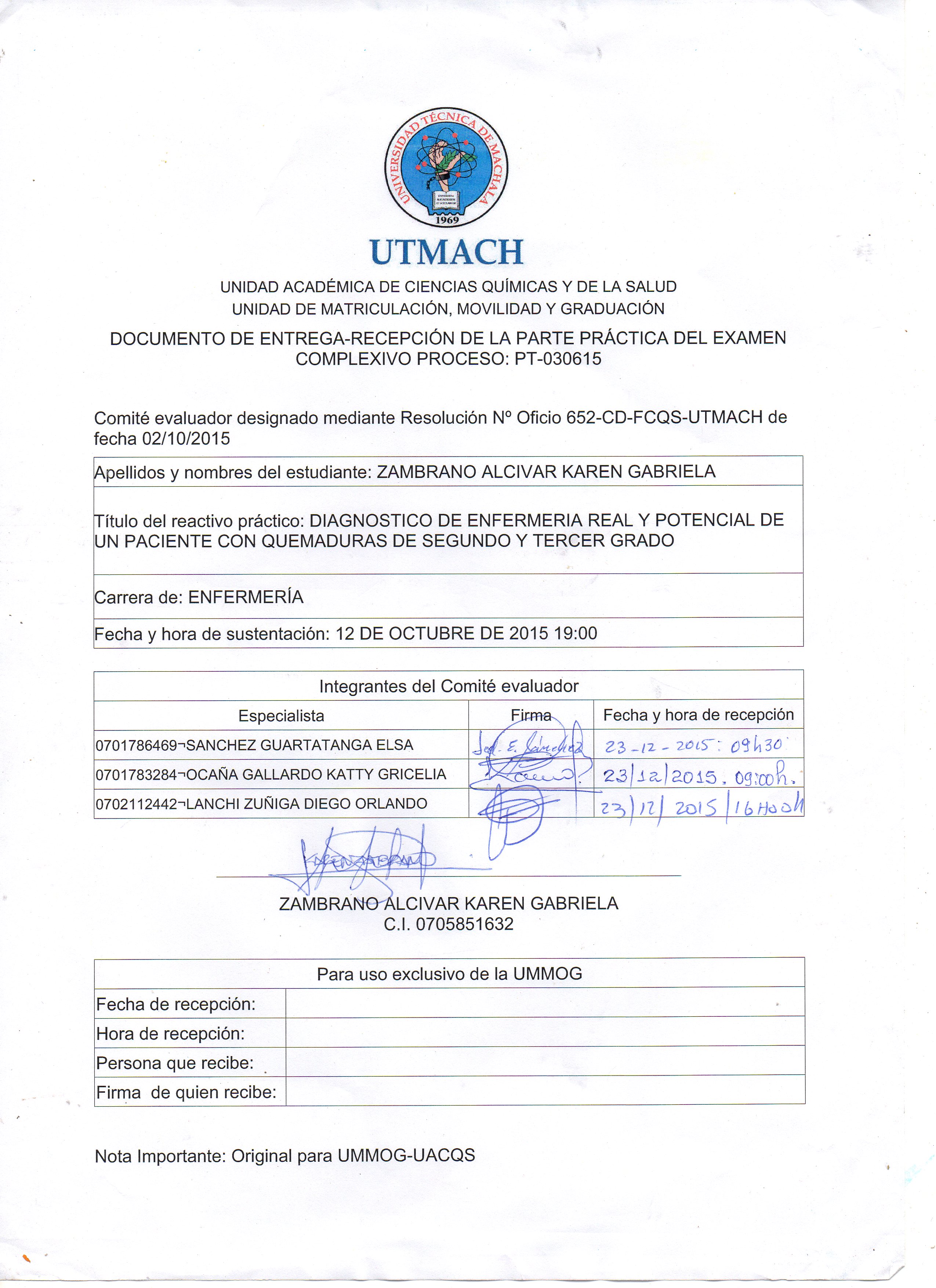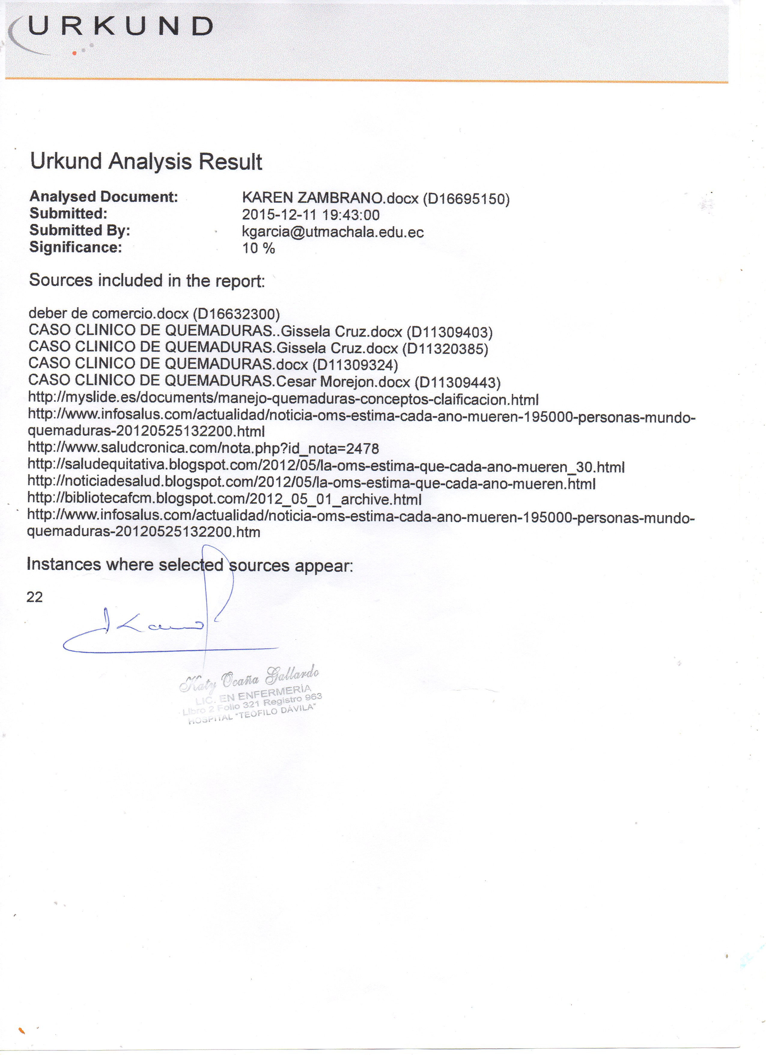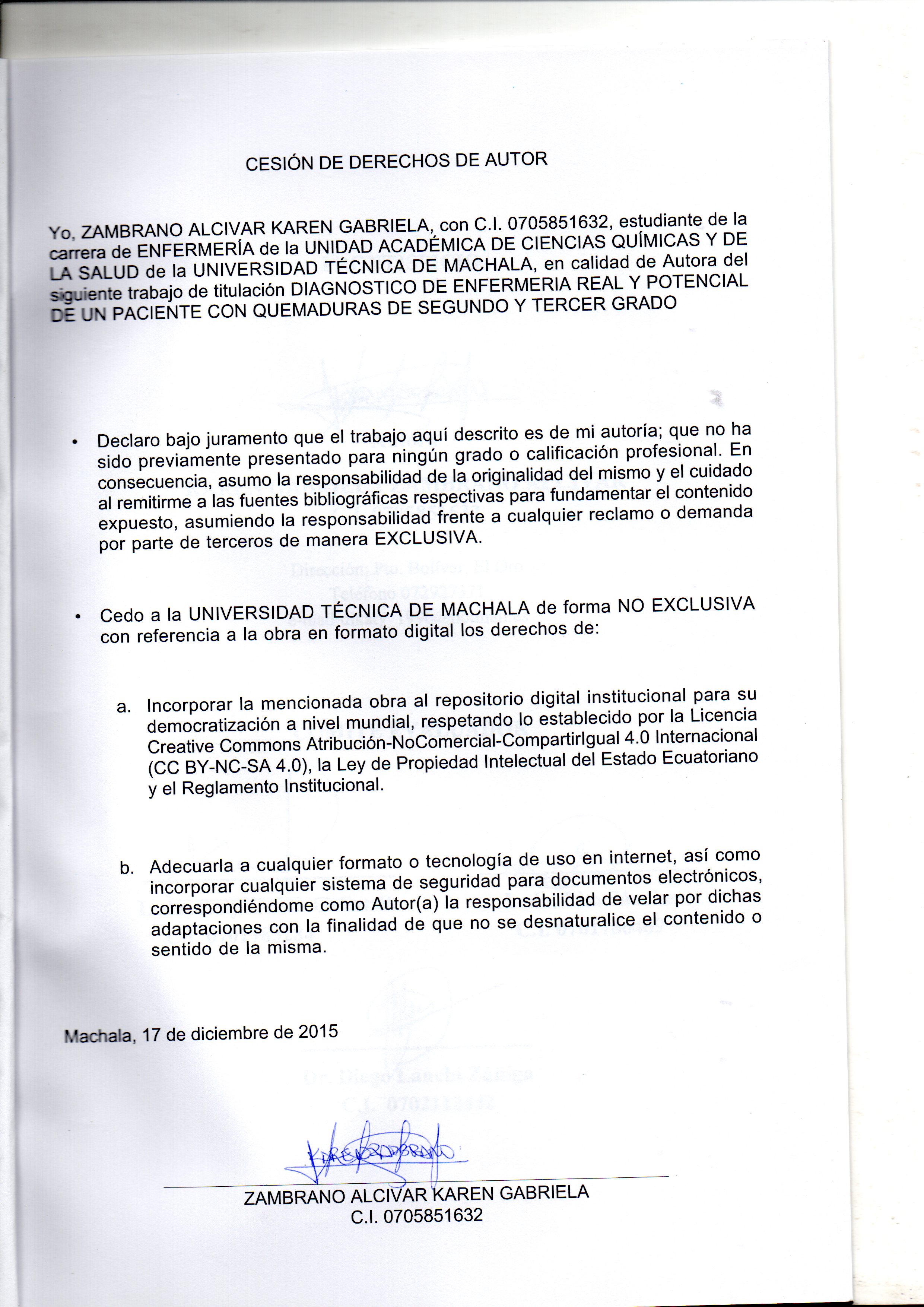 Zambrano Alcívar, K. G. (2015) Diagnóstico de enfermería real y potencial de un paciente con quemaduras de segundo y tercer grado. (Examen complexivo). UTMACH, Unidad Académica de Ciencias Química y de la Salud, Machala, Ecuador.