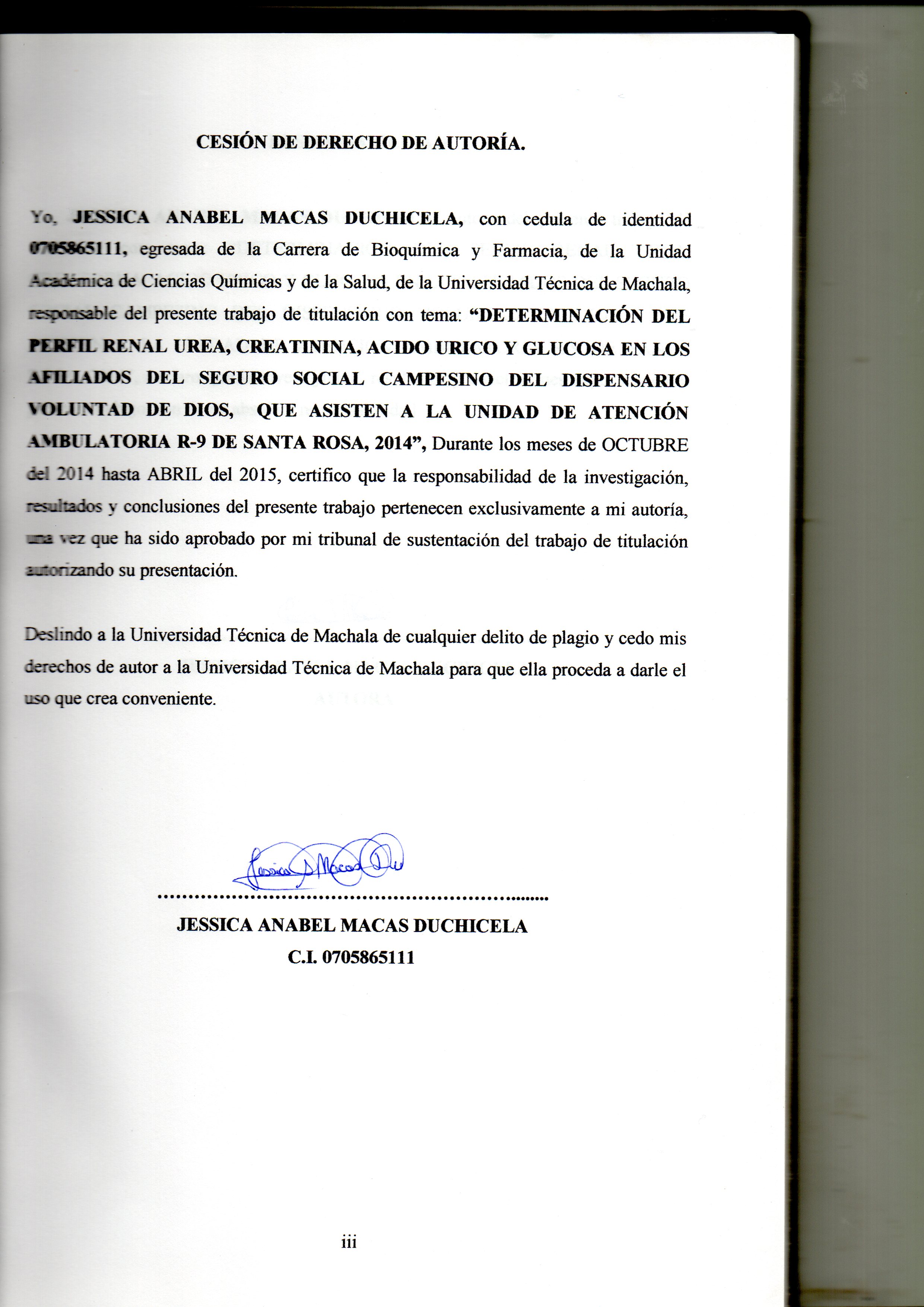 Macas Duchicela,J. A. (2015) Determinación del perfil renal urea, creatinima , acido urico y glucosa en los afiliados del seguro social campesino del dispensario Voluntad de Dios, que asisten a la Unidad de Atención Ambulatoria R-9 de Santa Rosa , 2014.(trabajo de titulación). UTMACH, Unidad Académica de Ciencias Química y de la Salud, Machala, Ecuador.
