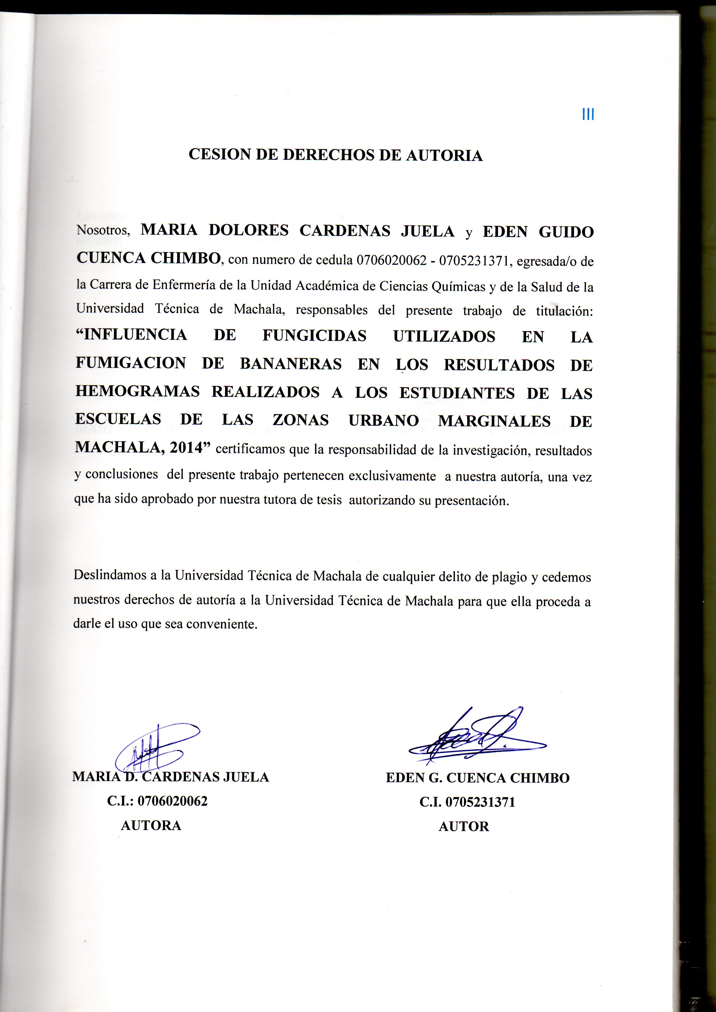 Cárdenas Juela,M,D ,Cuenca Chimbo ,E,G. (2015).Influencia de fungicidas utilizados en la fumigación de bananeras en los resultados de hemogramas realizados a los estudiantes de las escuelas de las zonas urbano marginales de Machala , 2014. (trabajo de titulación). UTMACH, Unidad Académica de Ciencias Química y de la Salud, Machala, Ecuador.