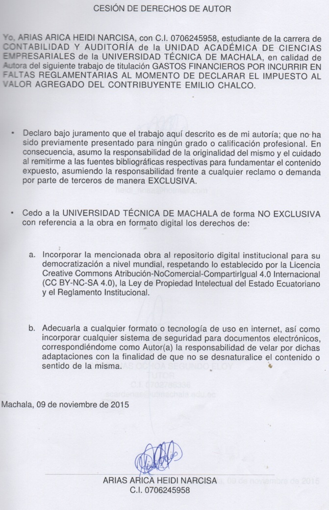 Arias Arica, H. N. (2015). Gastos financieros por incurrir en faltas reglamentarias al momento de declarar el impuesto al valor agregado del contribuyente Emilio Chalco (trabajo de titulación). UTMACH, Unidad Académica de Ciencias Empresariales, Machala, Ecuador.