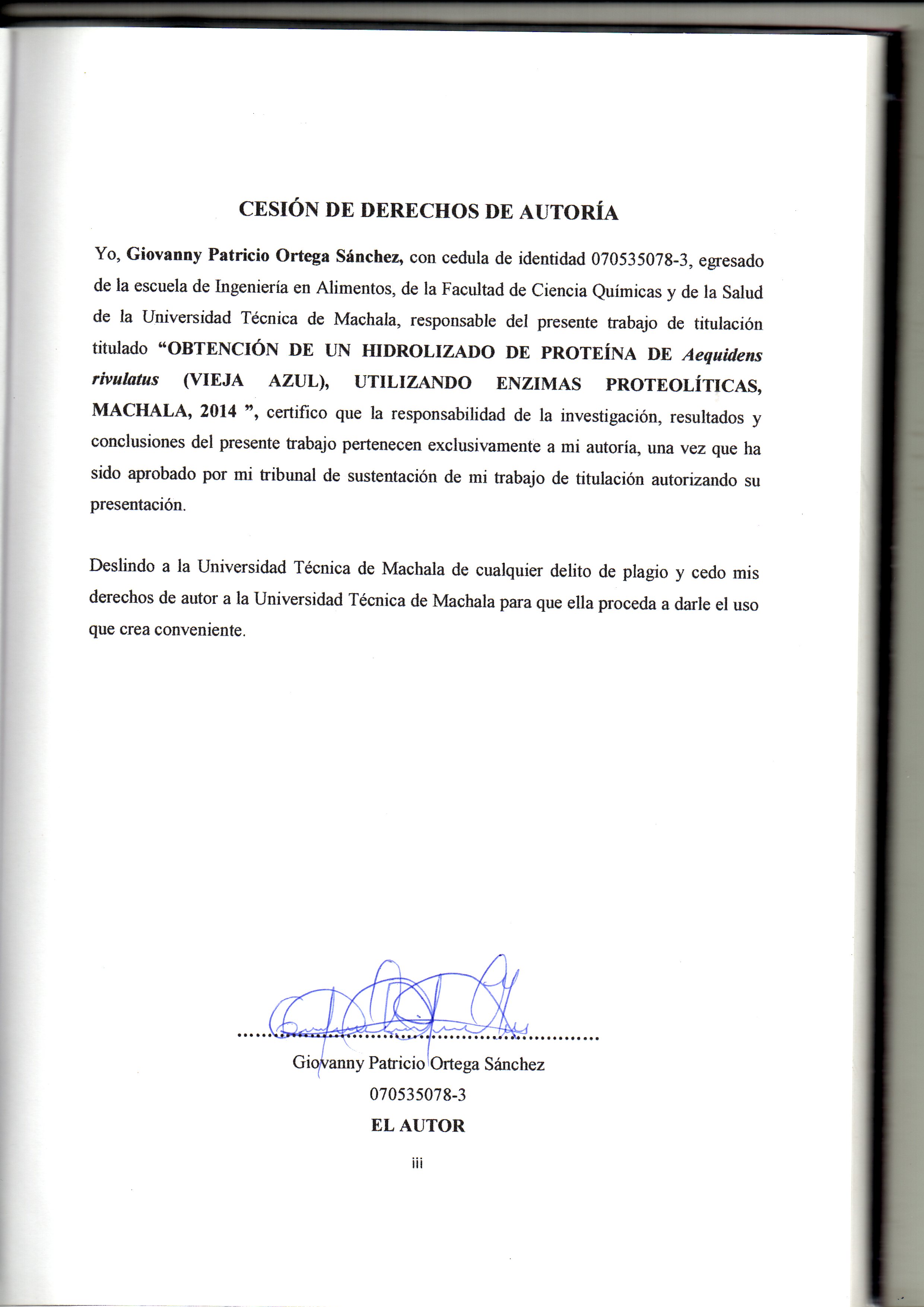 Obtención de un hidrolizado de proteína de Aequindens rivulatus (Vieja Azul), utilizando enzimas proteolíticas, Machala , 2014.