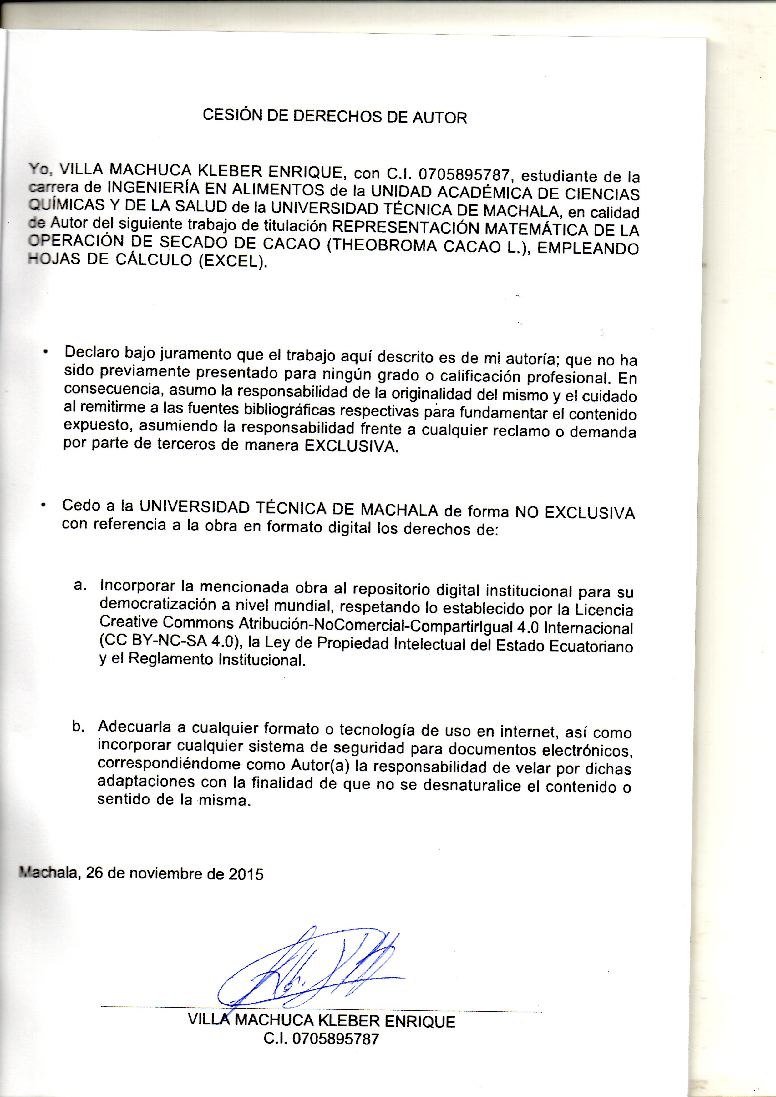 Villa Machuca, K. E. (2015) Representación matemática de la operación de secado de cacao (Theobroma Cacao L.), empleando hojas de cálculo (Excel). (Examen complexivo). UTMACH, Unidad Académica de Ciencias Química y de la Salud, Machala, Ecuador.