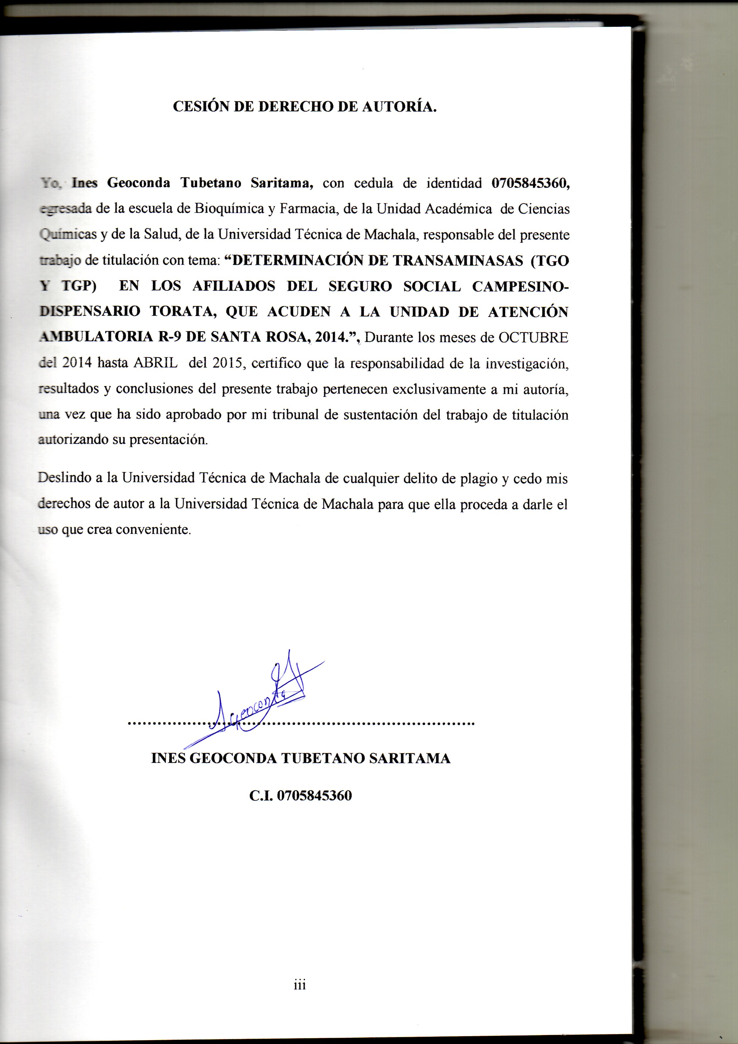 Tubetano Saritama, I. G. (2015) Determinación de transaminas (TGO Y TGP) en los afiliados del Seguro Social Campesino-dispensario Torata, que acude a la unidad de atención ambulatoria R-9 de Santa Rosa, 2014. (Trabajo de titulación). UTMACH, Unidad Académica de Ciencias Química y de la Salud, Machala, Ecuador.