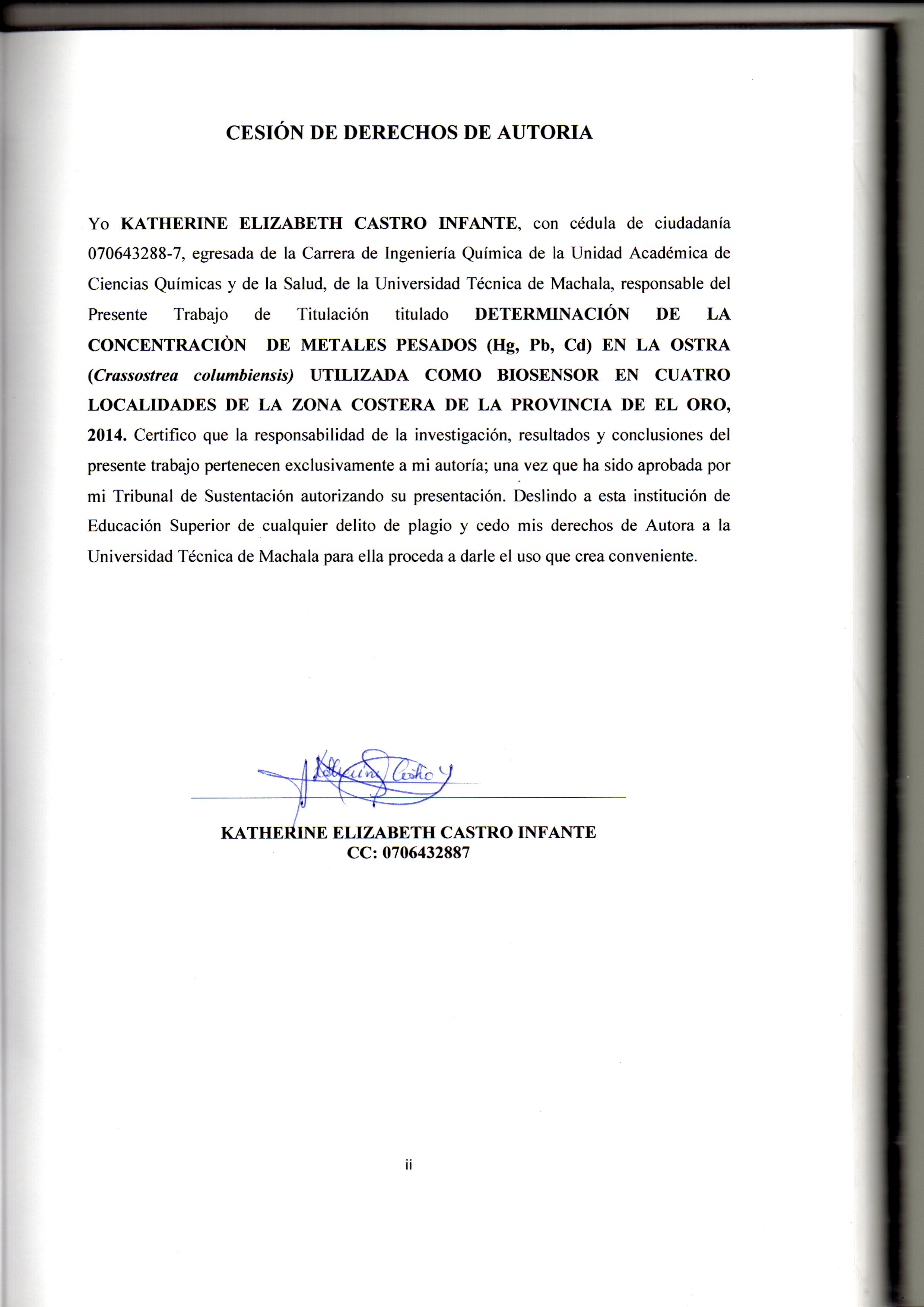 Castro Infante, K. E. (2015) Determinación de la concentraciòn de metales pesados (hg, pb, cd) en la ostra (crassostrea columbiensis) utilizada como biosensor en cuatro localidades de la zona costera de la provincia de el Oro, 2014. (Trabajo de titulación). UTMACH, Unidad Académica de Ciencias Química y de la Salud, Machala, Ecuador.