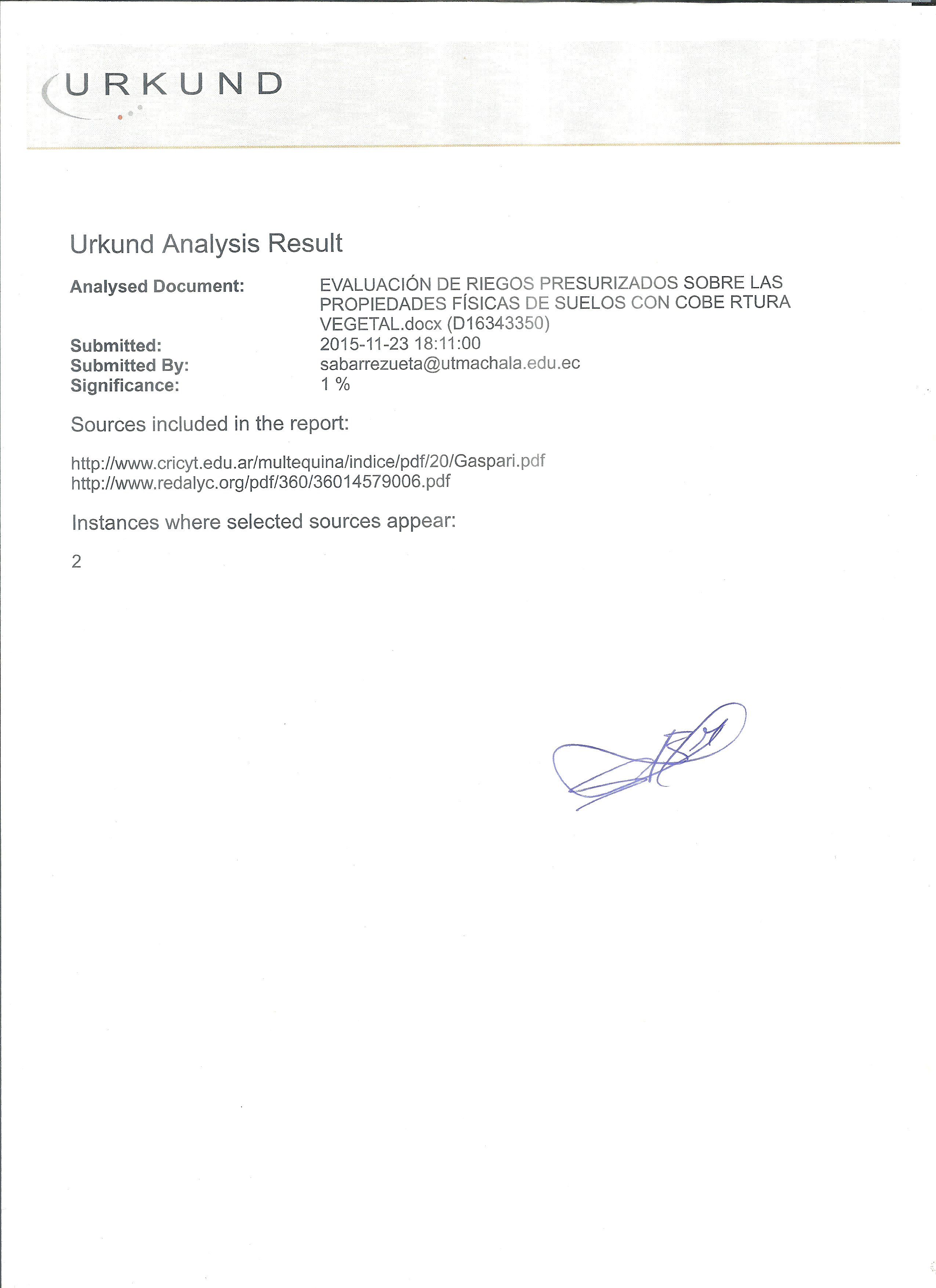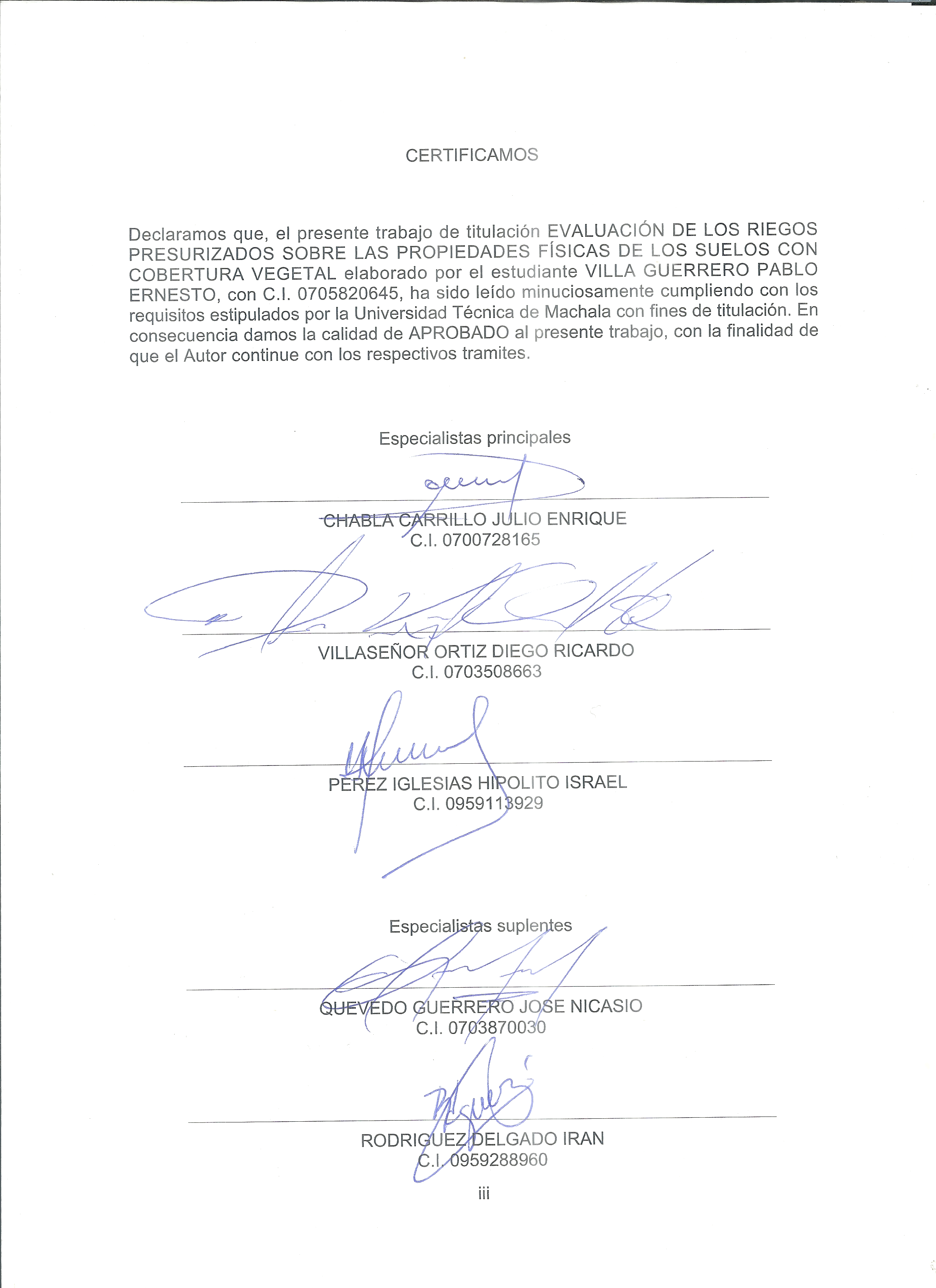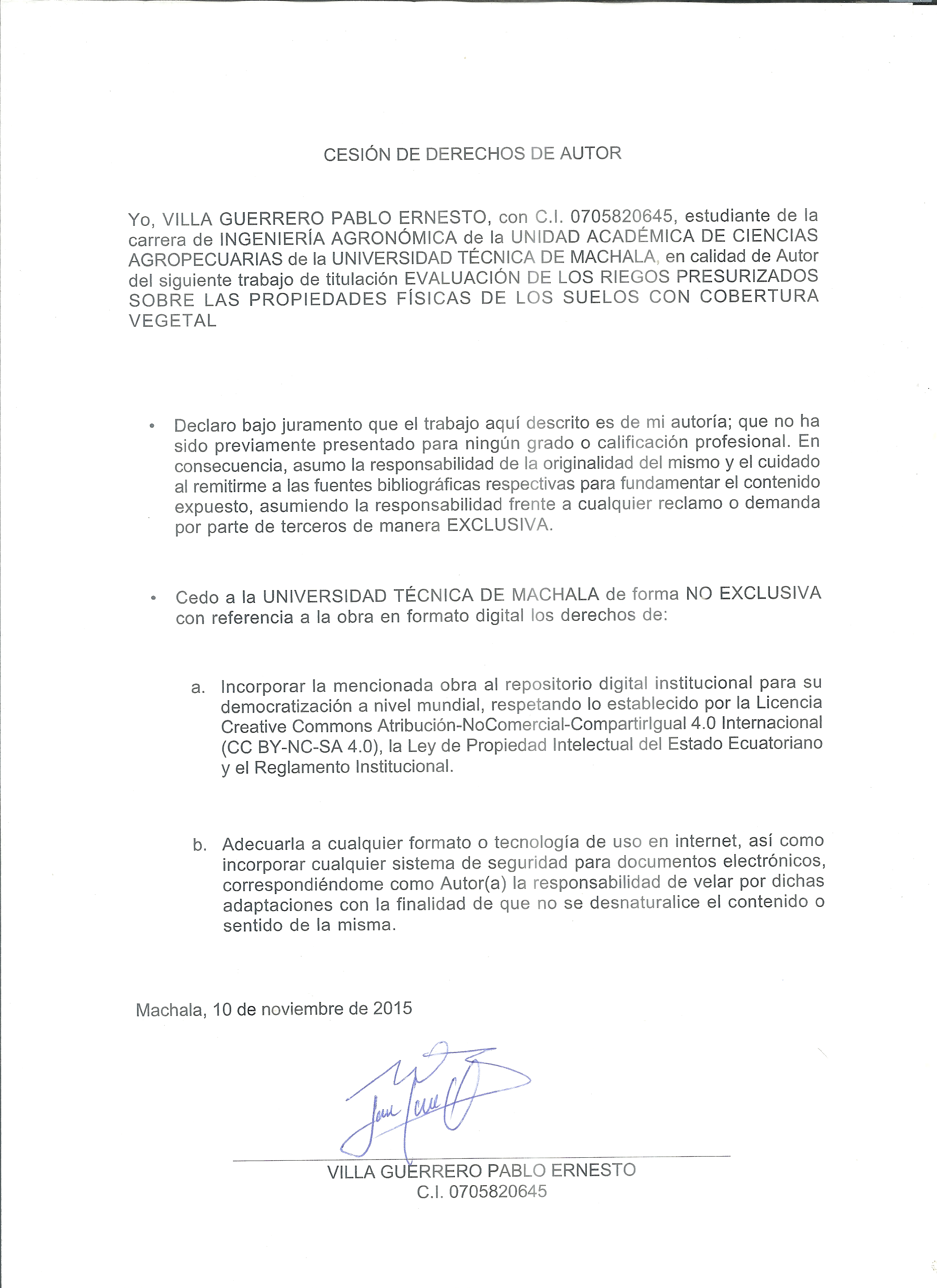 Villa Guerrero, P. E. (2015) Evaluación de los riegos presurizados sobre las propiedades físicas de los suelos con cobertura vegetal. (Trabajo de titulación). UTMACH, Unidad Académica de Ciencias Agropecuarias, Machala, Ecuador.