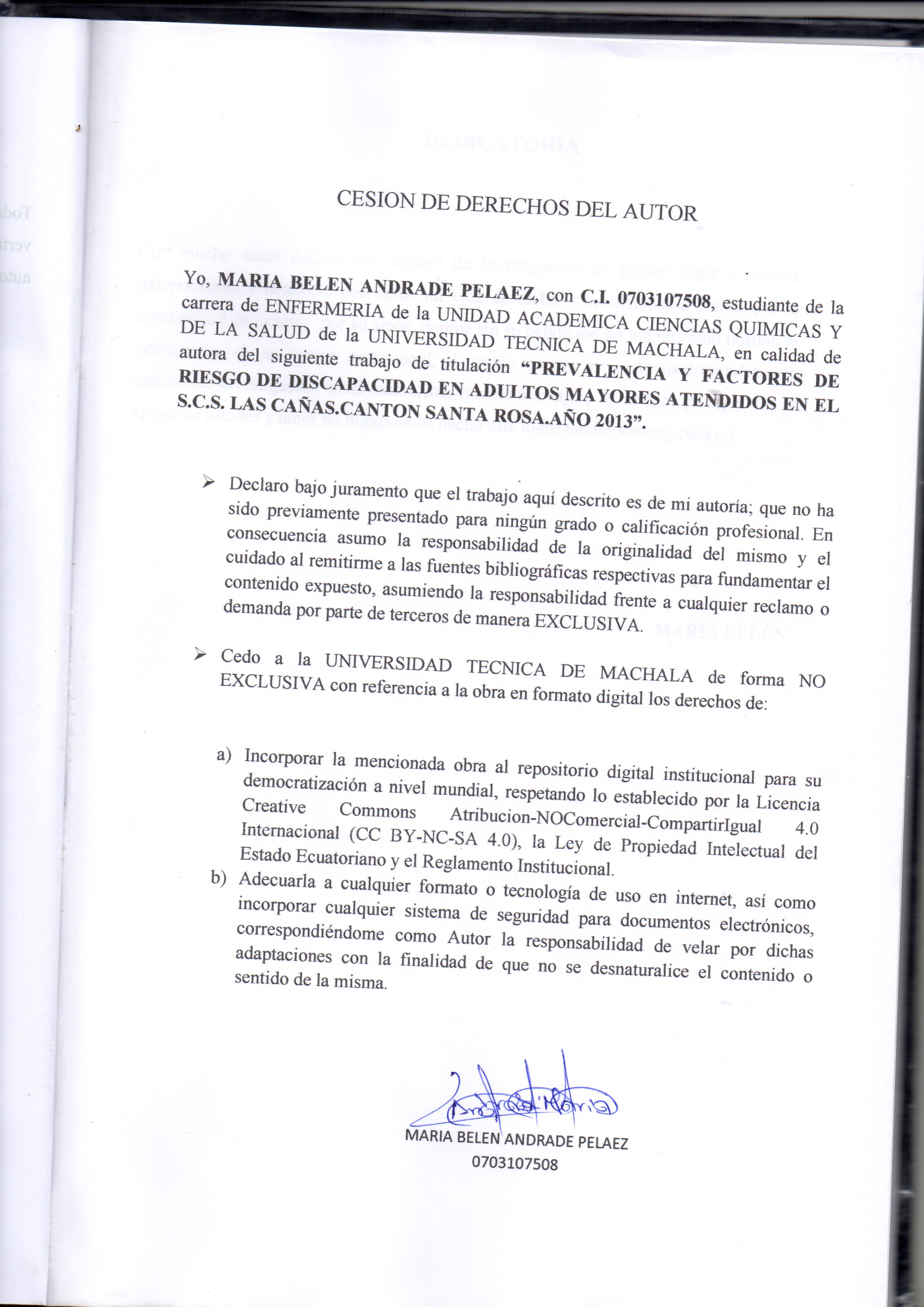 Andrade Peláez, M. B. (2016) Prevalencia y fatores de riesgo de discapacidaden adultos mayores atendidos en el S.C.S. Las Cañas canton Santa Rosa, año 2013. (Trabajo de Titulación) UTMACH, Unidad Académica de Ciencias Química y de la Salud, Machala, Ecuador.
