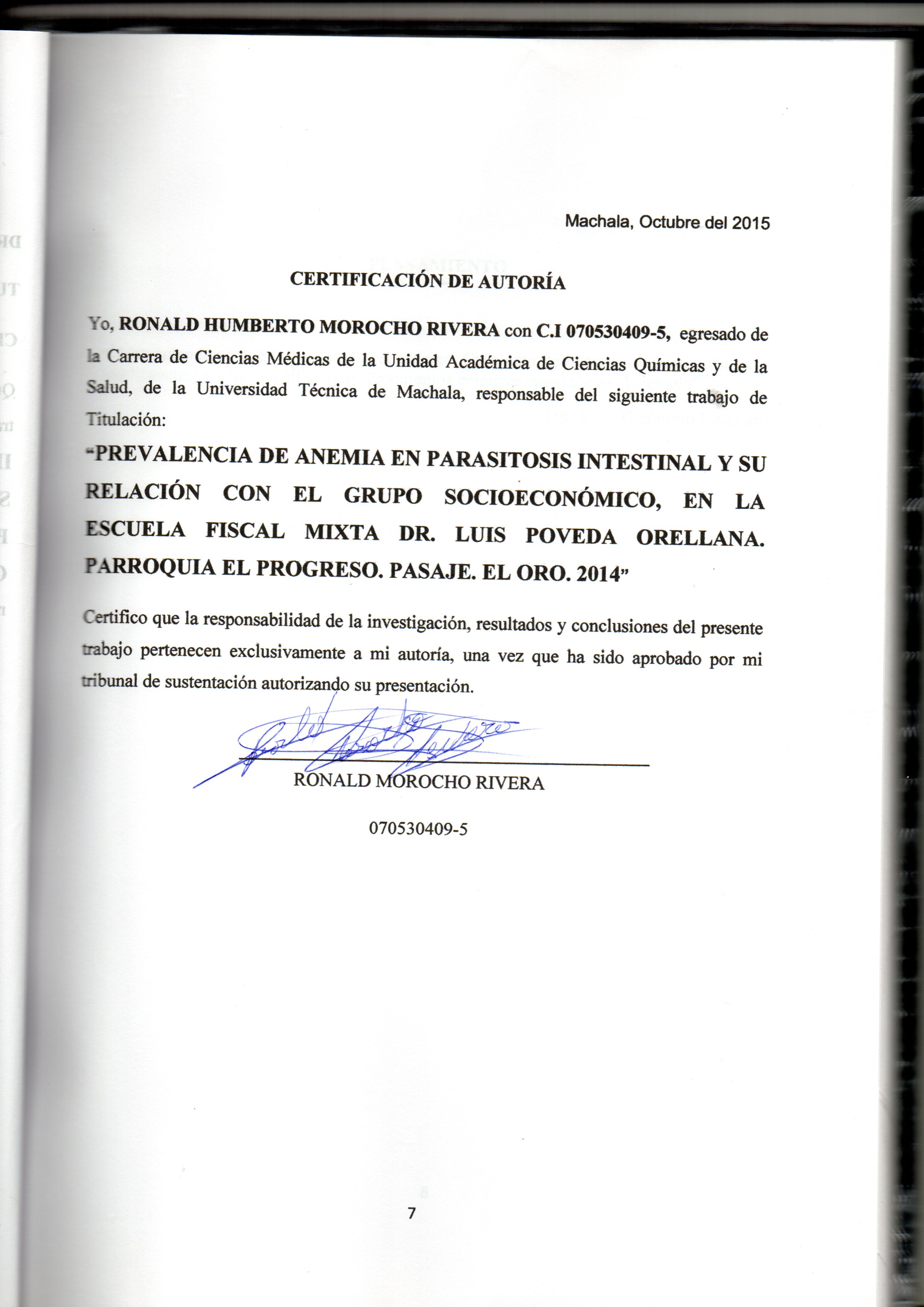 Morocho Rivera, R. H. (2015) Prevalencia de anemia en parasitosis intestinal y su relación con el grupo socioeconómico, en la Escuela Fiscal Mixta Dr. Luis Poveda Orellana. Parroquia El Progreso. Pasaje. El Oro. 2014. (Trabajo de titulación). UTMACH, Unidad Académica de Ciencias Química y de la Salud, Machala, Ecuador.