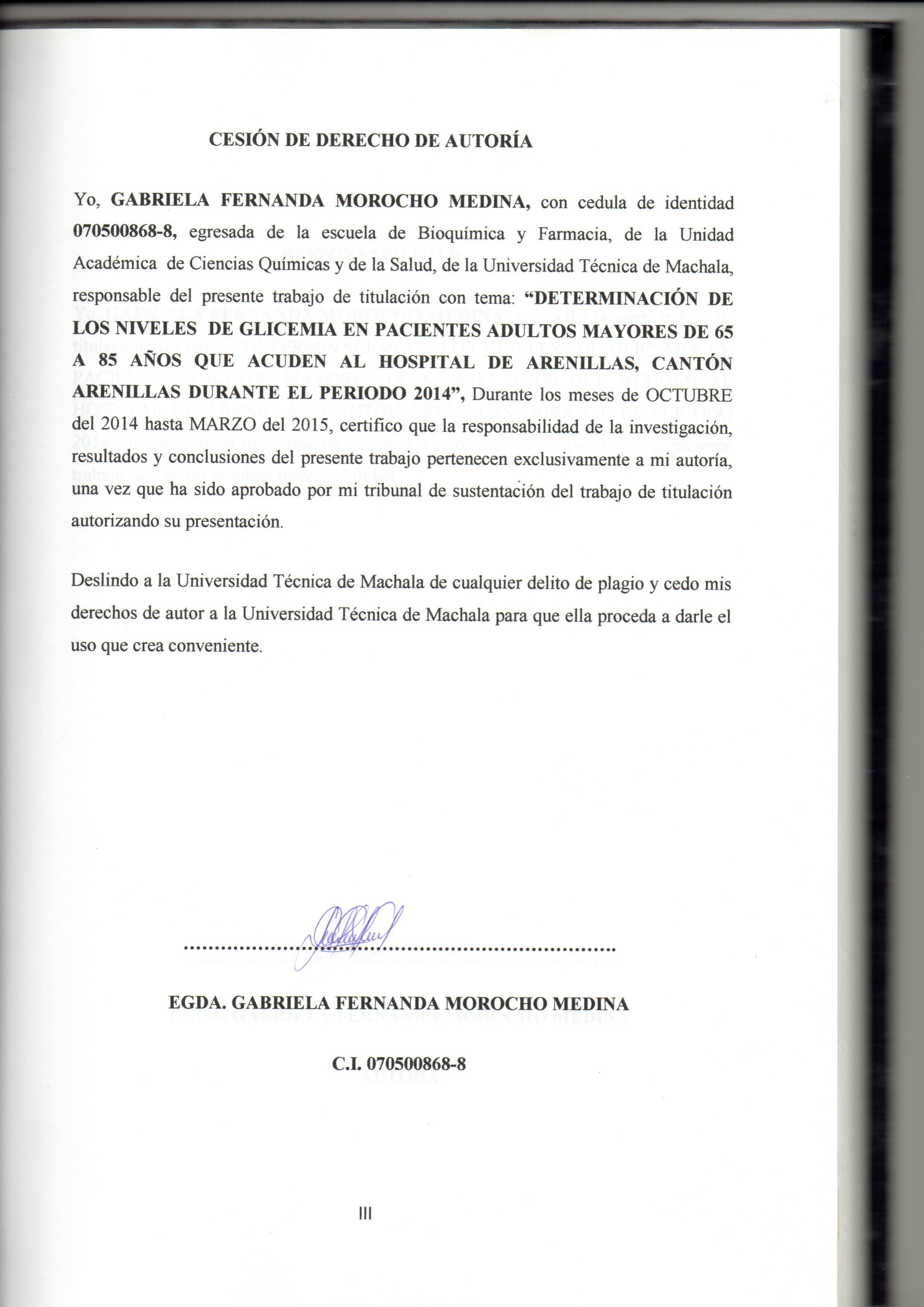 Morocho Medina, G. (2015) Determinación de los niveles de glicemia en pacientes adultos mayores de 65 a 85 años que acuden al hospital de Arenillas, cantón Arenillas durante el periodo 2014, Machala 2015. (Trabajo de titulación) UTMACH, Unidad Académica de Ciencias Química y de la Salud, Machala, Ecuador.