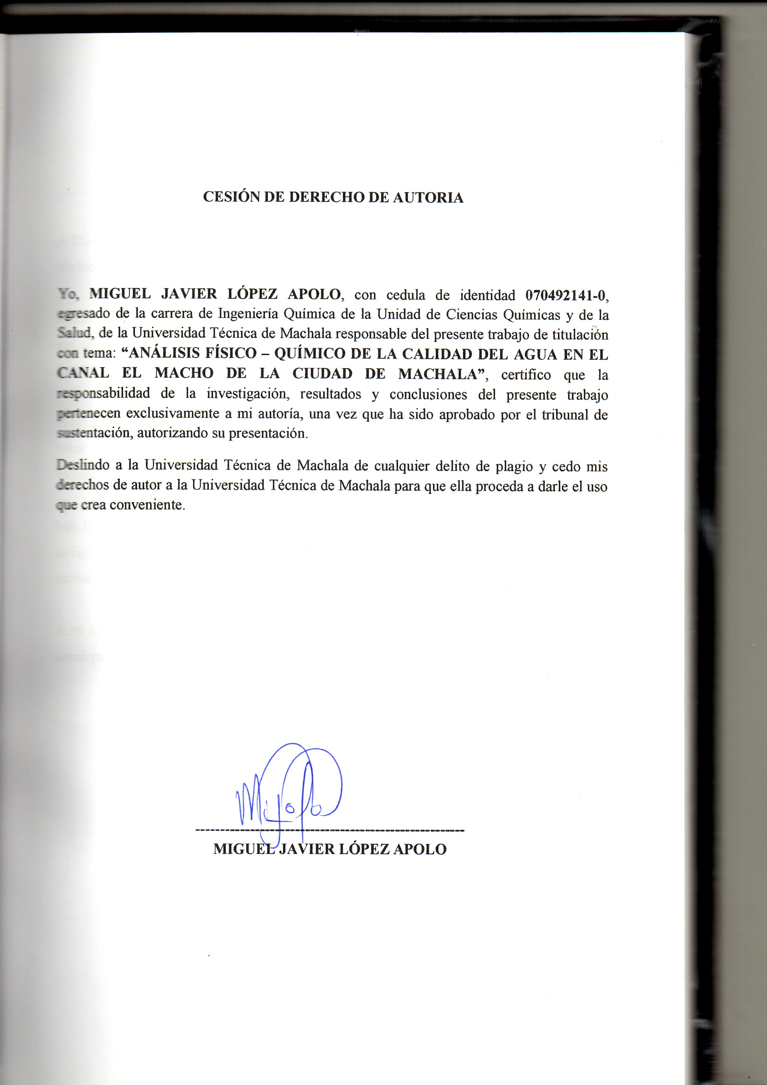 López Apolo, M. J. (2015). Análisis físico-químico de la calidad del agua en el canal El Macho de la ciudad de Machala (tesis de pregrado). UTMACH, Unidad Académica de Ciencias Química y de la Salud, Machala, Ecuador.