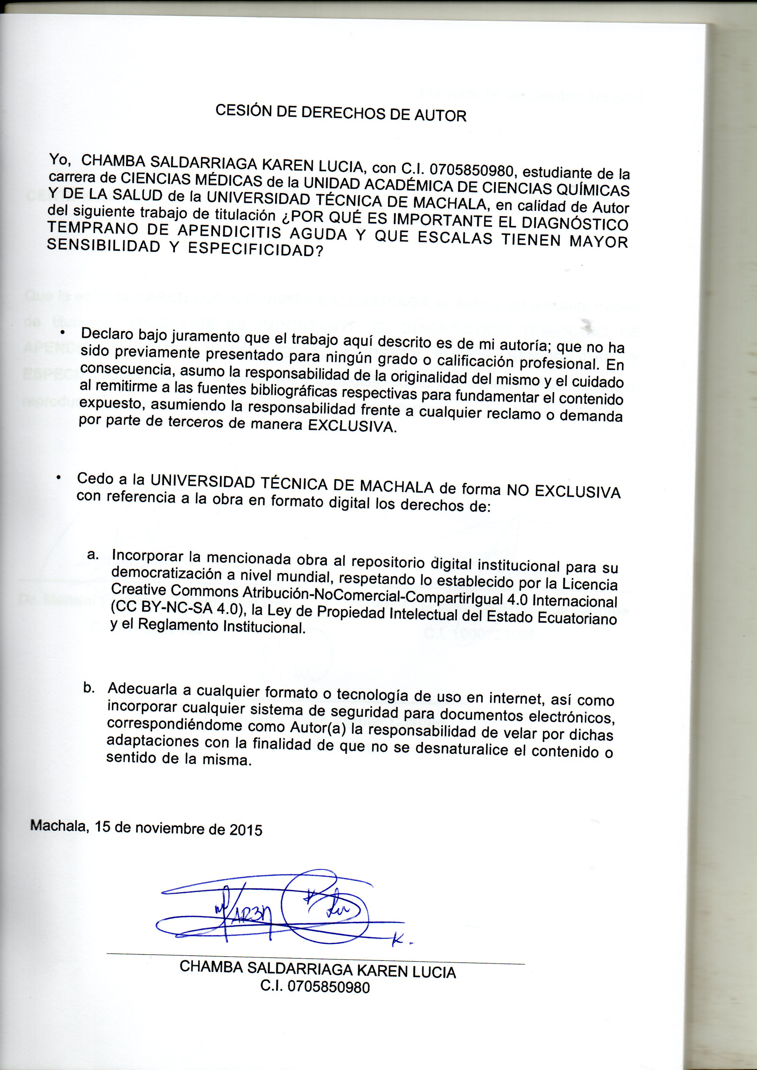 Chamba Saldarriaga, K. L. (2015) ¿Por qué es importante el diagnóstico temprano de Apendicitis Aguda, y que escalas tienen mayor Sensibilidad y Especificidad? (Examen complexivo). UTMACH, Unidad Académica de Ciencias Química y de la Salud, Machala, Ecuador.