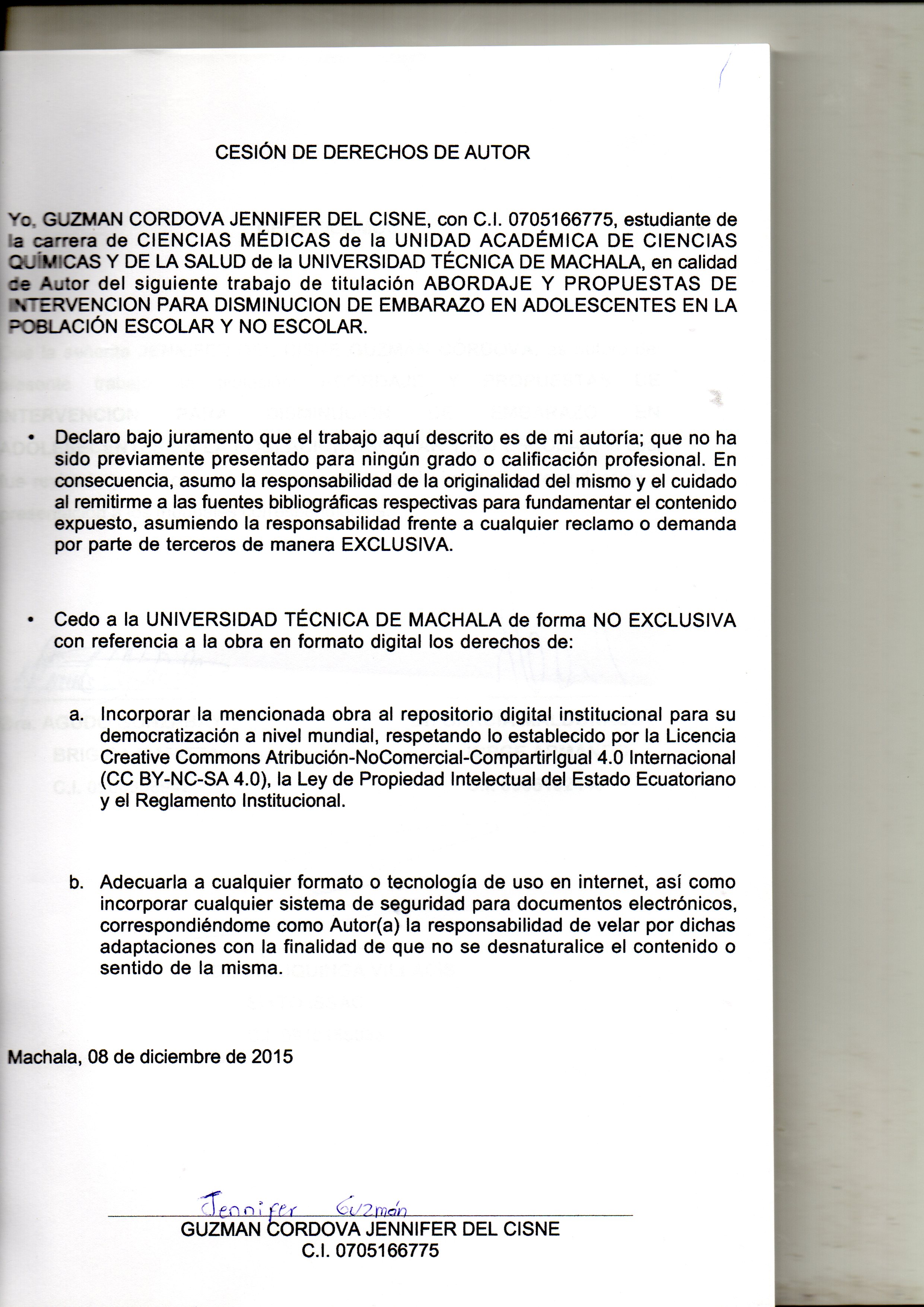 Guzman Cordova, J .C. (2015).Abordaje y propuesta de intervención para disminución de embarazo en adolescente en la población escolar y no escolar. (Examen complexivo). UTMACH, Unidad Académica de Ciencias Química y de la Salud, Machala, Ecuador.