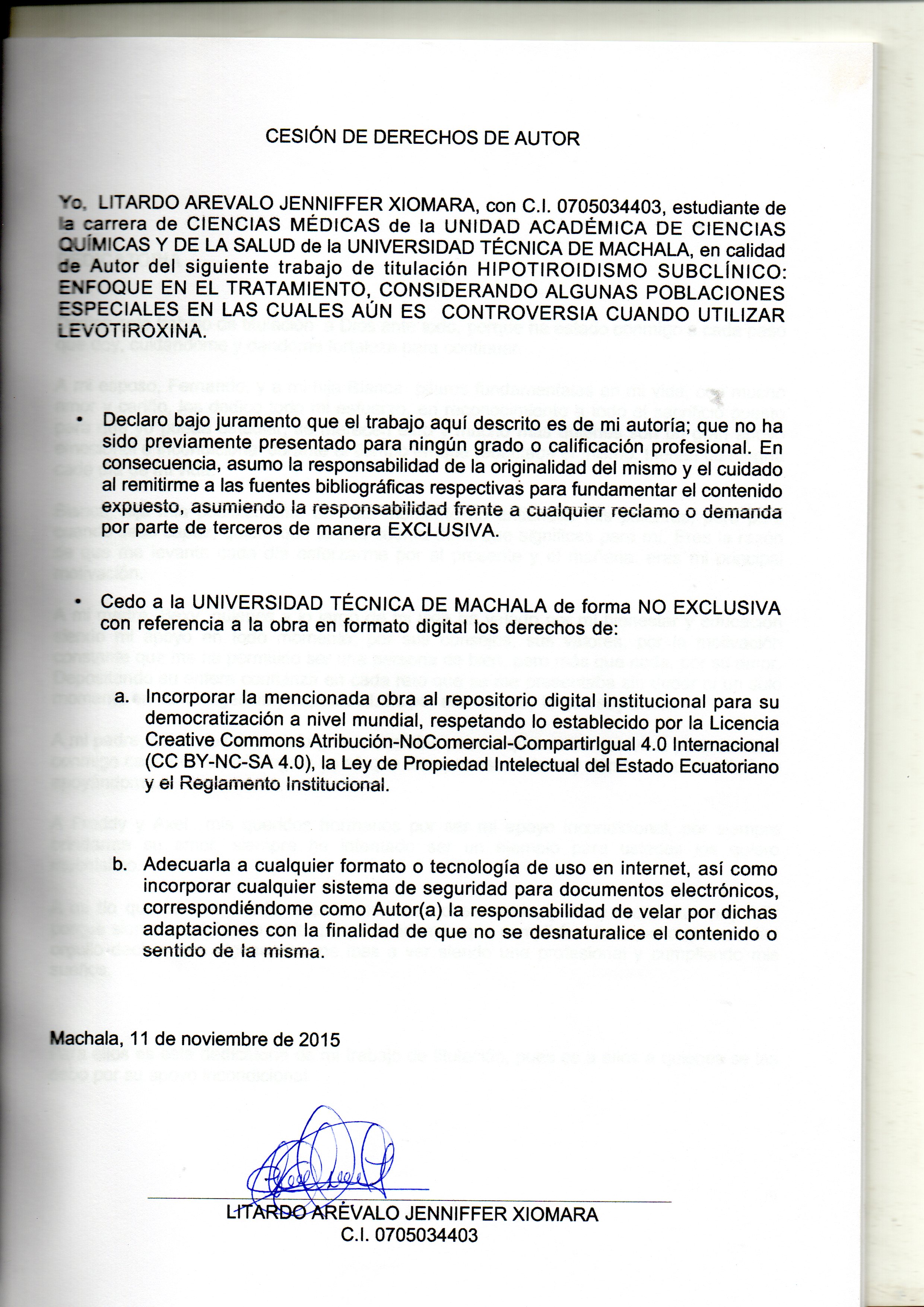 Litardo Arévalo, J. X. (2015) Hipotiroidismo subclínico: enfoque en el tratamiento, considerando algunas poblaciones especiales en las cuales aún es controversia cuando utilizar levotiroxina. (Trabajo de titulación). UTMACH, Unidad Académica de Ciencias Química y de la Salud, Machala, Ecuador.
